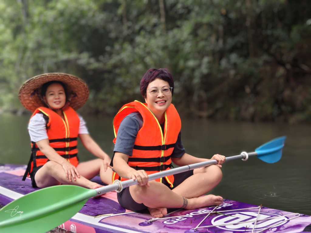 Khách du lịch trải nghiệm hoạt động chèo sup ở suối khi đến Am Váp Farm Kỳ Thượng. Ảnh: Đơn vị cung cấp.