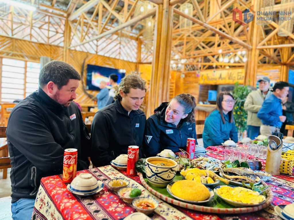 Khách nước ngoài thưởng thức đặc sản của người dân tộc ở Kỳ Thượng.