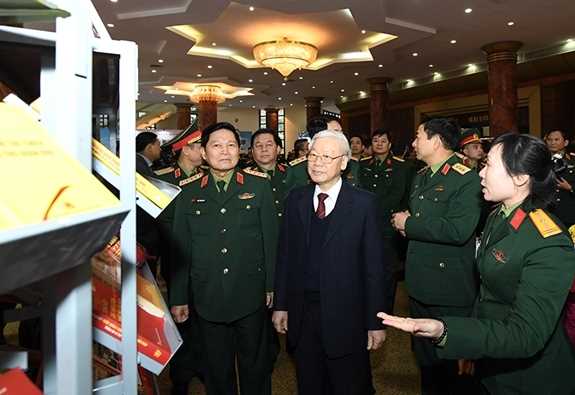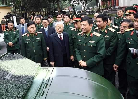 Cố Tổng Bí thư Nguyễn Phú Trọng thăm các gian trưng bày tại Hội nghị Quân chính toàn quân năm 2018. Ảnh: Báo qdnd.vn.