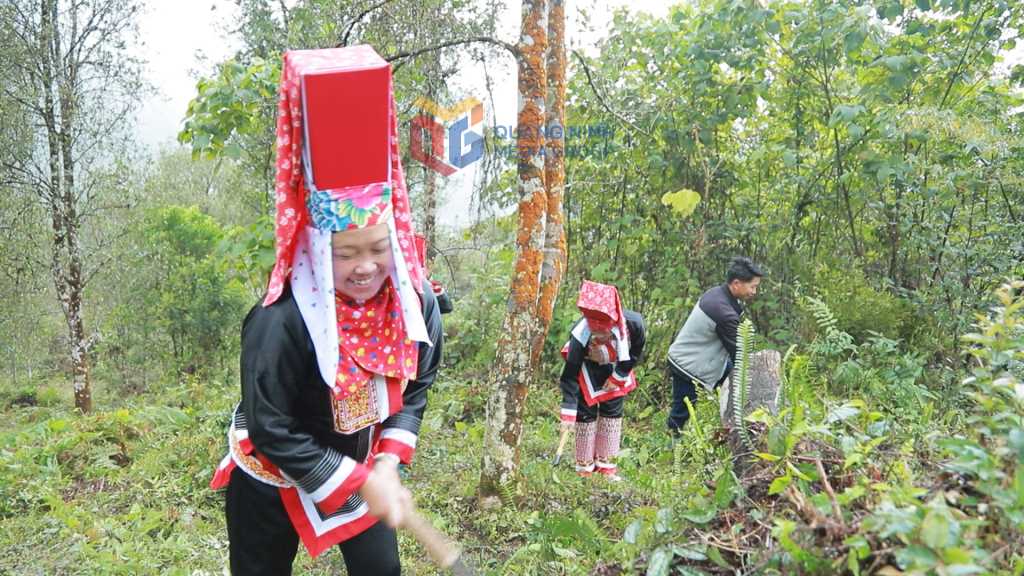 Người dân xã Hoành Mô chăm sóc rừng trồng.