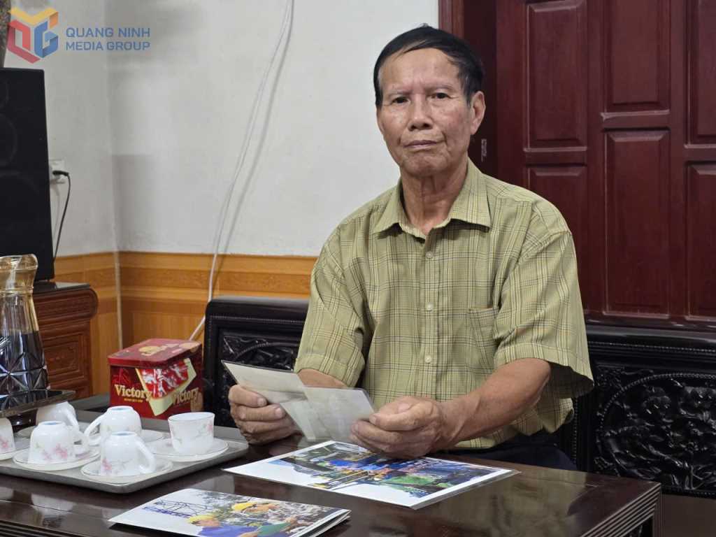 Anh hùng Lao động Nguyễn Xuân Quý xem lại những bức ảnh kỷ niệm trong những năm tháng lao động sản xuất.