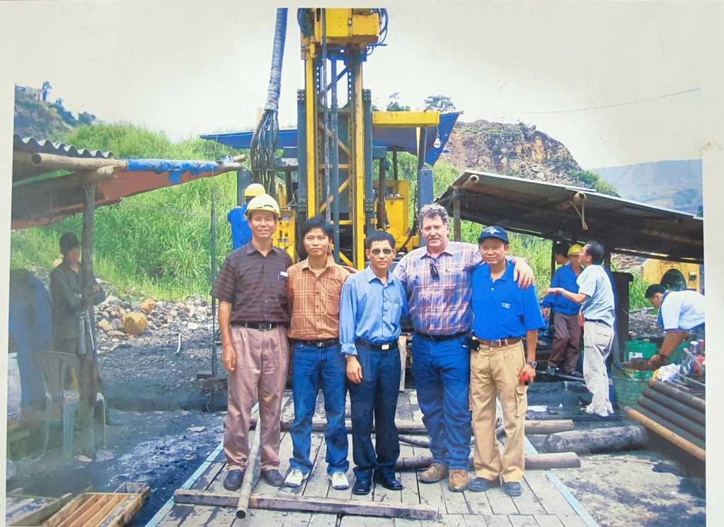 Anh hùng Lao động Nguyễn Xuân Quý (ngoài cùng, bên trái) chụp ảnh lưu niệm cùng các chuyên gia Nhật và chuyên gia nước ngoài tại Dự án khoan thăm dò địa chất tại Mạo Khê.