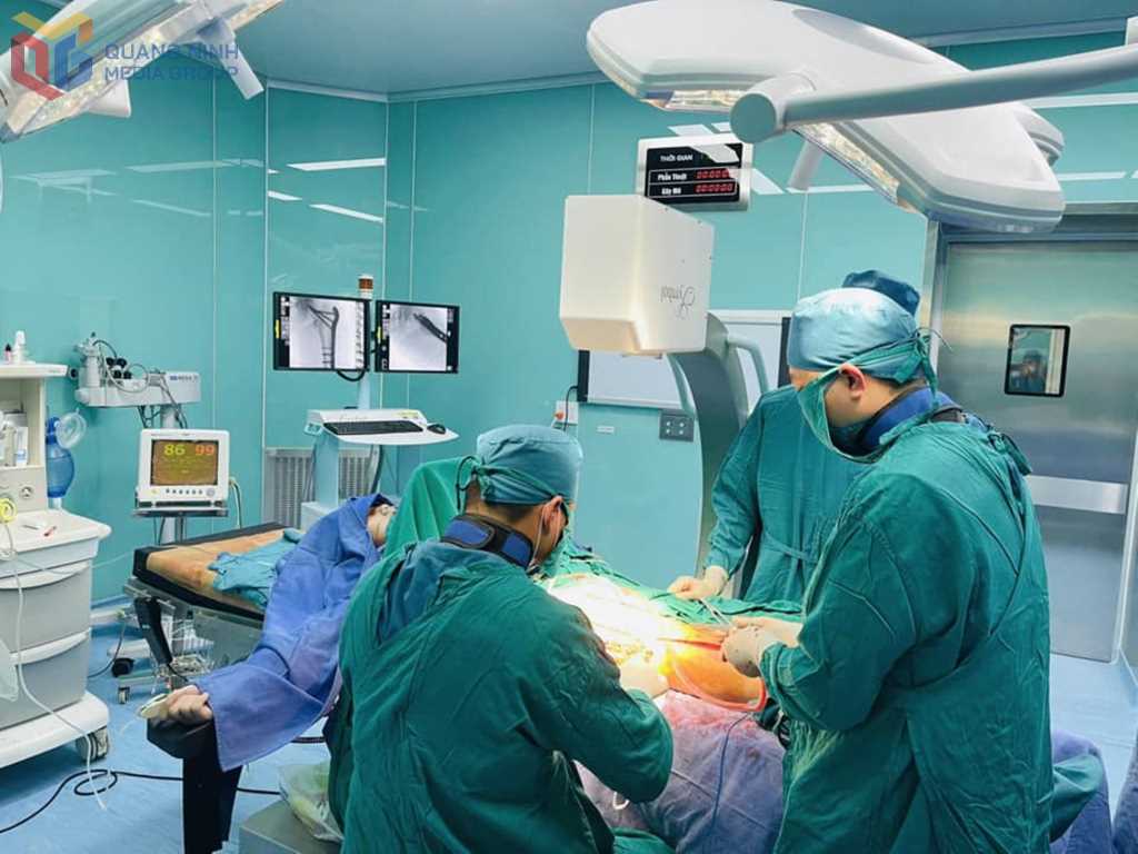 Y, bác sĩ Trung tâm Y tế Tiên Yên thực hiện ca phẫu thuật kết hợp xương trên máy C-arm (màn hình tăng sáng) cho bệnh nhân gãy xương chân.