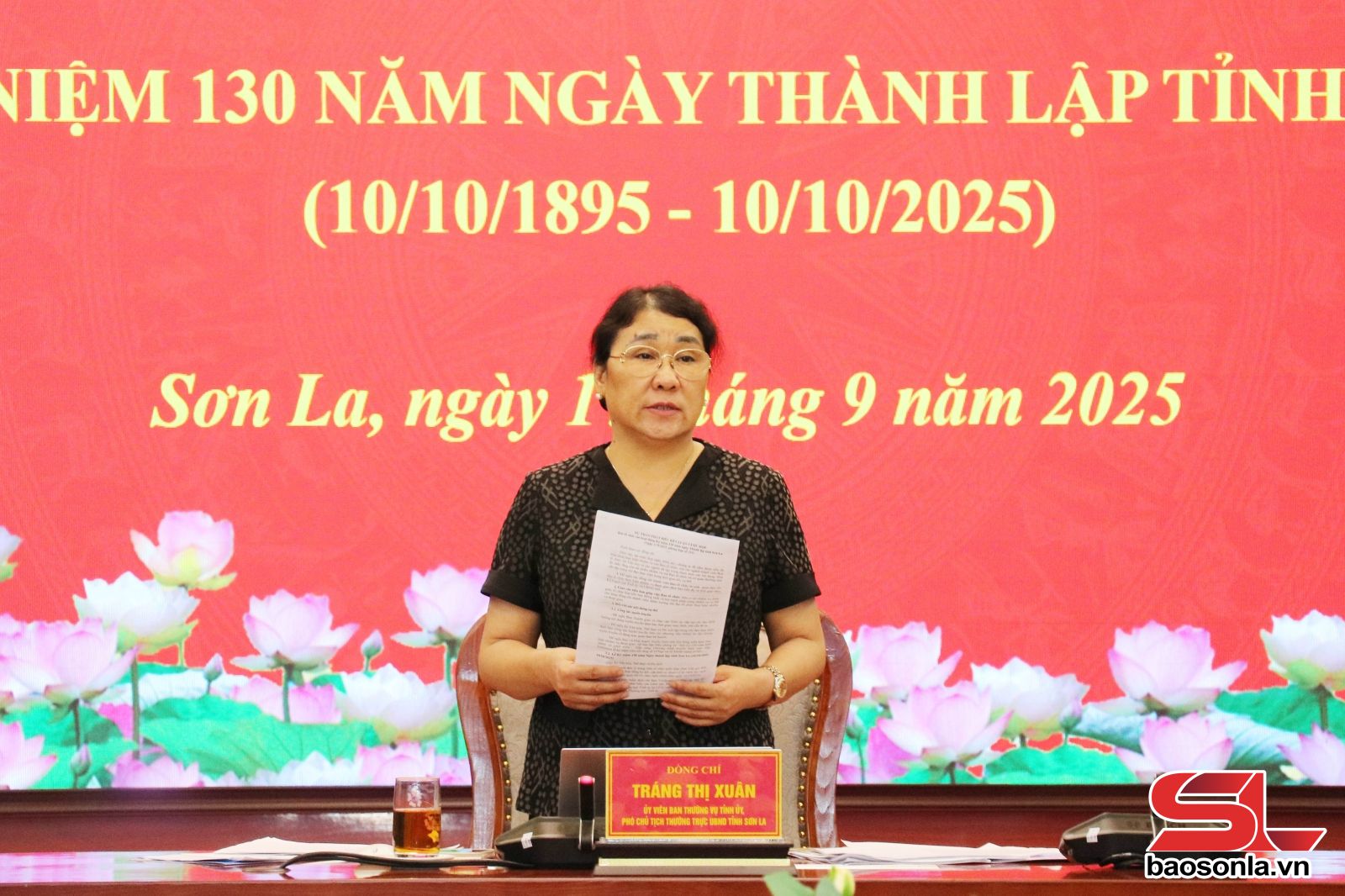 Ngày 17/9, đồng chí Tráng Thị Xuân, Ủy viên Ban Thường vụ Tỉnh ủy, Phó Chủ tịch Thường trực UBND tỉnh, Phó trưởng Ban Thường trực Ban tổ chức Lễ kỷ niệm, đã chủ trì cuộc họp triển khai nhiệm vụ chuẩn bị Lễ kỷ niệm 130 năm Ngày thành lập tỉnh Sơn La (10/10/1895 - 10/10/2025).