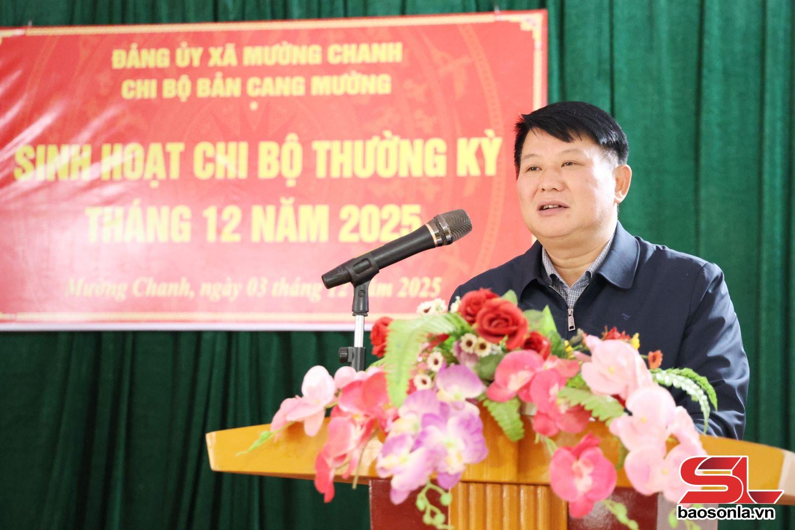 Đề nghị Chi bộ đẩy mạnh công tác phát triển Đảng, nhất là đảng viên nữ, đảng viên trẻ, đảng viên trong lực lượng dân quân, công an viên. Thực hiện tốt đào tạo nghề, giải quyết việc làm; tuyên truyền về chính sách đưa lao động đi làm việc ở nước ngoài theo hợp đồng. Đảng ủy xã Mường Chanh tiếp tục quan tâm lãnh đạo, cung cấp thông tin đầy đủ cho chi bộ; kịp thời giải quyết các kiến nghị của đảng viên và nhân dân; tuyên truyền làm tốt công tác triển khai bầu cử đại biểu Quốc hội khóa XVI và đại biểu Hội đồng nhân dân các cấp nhiệm kỳ 2026-2031.
