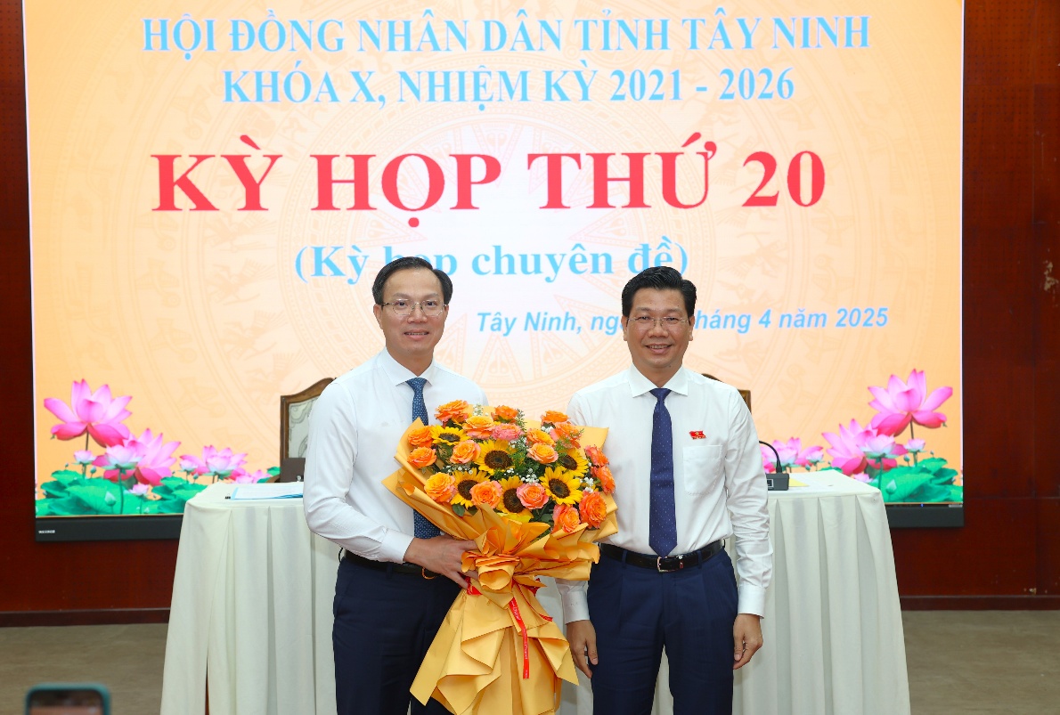 Bí thư Tỉnh ủy, Chủ tịch HĐND tỉnh Nguyễn Mạnh Hùng chúc mừng đồng chí Đoàn Trung Kiên được HĐND tỉnh bầu chức Phó Chủ tịch UBND tỉnh Tây Ninh