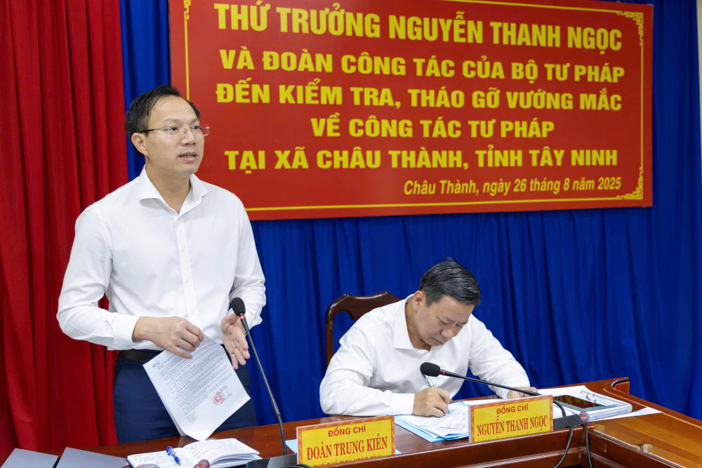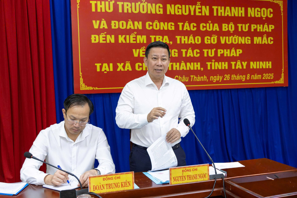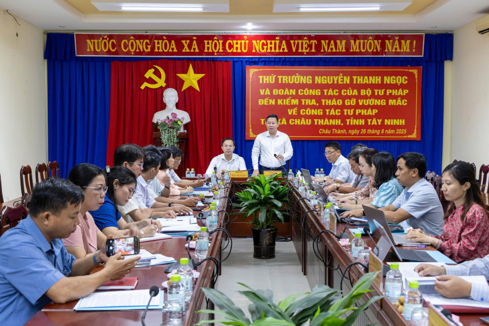 Sáng 26/8, Thứ trưởng Bộ Tư pháp Nguyễn Thanh Ngọc dẫn đầu đoàn công tác Bộ Tư pháp đến kiểm tra, tháo gỡ khó khăn, vướng mắc trong thực hiện mô hình chính quyền hai cấp ở lĩnh vực tư pháp tại xã Châu Thành, tỉnh Tây Ninh.