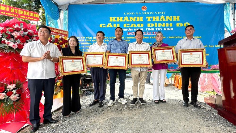 Dịp này, UBND tỉnh Tây Ninh tặng Bằng khen cho 1 tập thể và 6 cá nhân đóng góp cho công tác an sinh xã hội địa phương; UBND xã Nhơn Ninh tặng Giấy khen cho 2 tập thể và 17 cá nhân đóng góp vì sự phát triển của cộng đồng. Đơn vị tài trợ cũng trao quà cho các gia đình có hoàn cảnh khó khăn trên địa bàn xã Nhơn Ninh./.