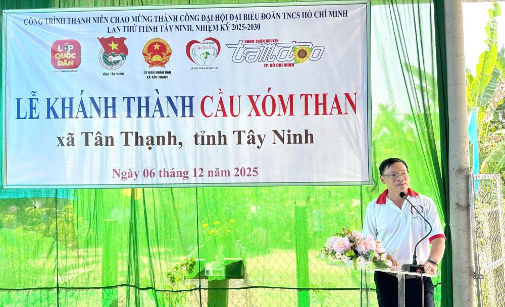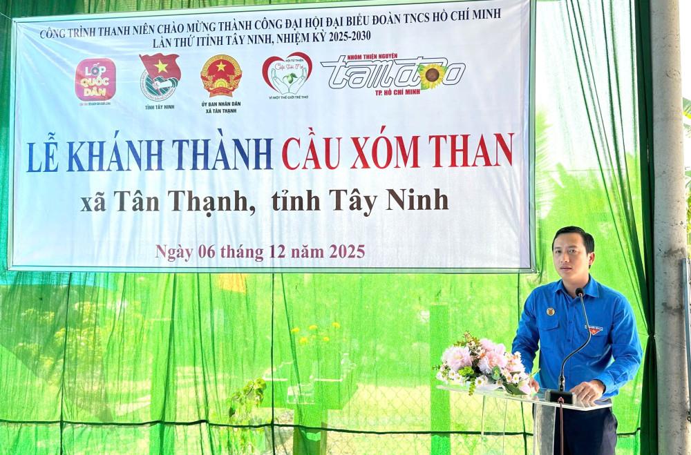 Bí thư Tỉnh Đoàn Tây Ninh Trần Hải Phú cho biết: “Thiết thực chào mừng thành công Đại hội đại biểu Đoàn TNCS Hồ Chí Minh tỉnh Tây Ninh lần thứ I, nhiệm kỳ 2025-2030, Tỉnh Đoàn Tây Ninh phối hợp chính quyền và Nhân dân xã Tân Thạnh, đơn vị tài trợ khánh thành cầu Xóm Than giúp người dân, các em học sinh đi lại dễ dàng, thúc đẩy kinh tế địa phương phát triển”.