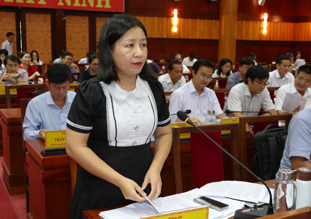 Đồng chí Huỳnh Thị Hồng Nhung – Chánh Văn phòng Tỉnh ủy trình bày dự thảo báo cáo tổng kết công tác xây dựng Đảng nhiệm kỳ 2020-2025