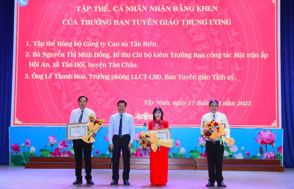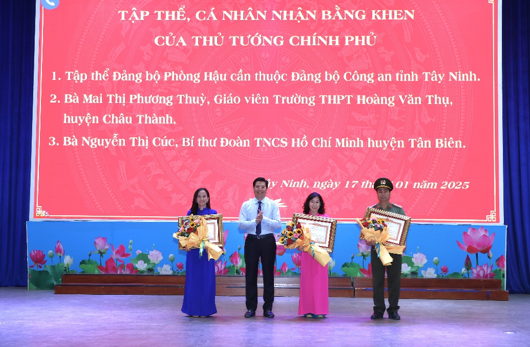 Cũng tại Hội nghị, Thường trực Tỉnh uỷ trao Bằng khen của Thủ tướng Chính phủ cho cho 01 tập thể, 02 cá nhân thuộc tỉnh Tây Ninh có thành tích tiêu biểu, điển hình trong học tập và làm theo tư tưởng, đạo đức, phong cách Hồ Chí Minh; trao Bằng khen của Ban Tuyên giáo Trung ương cho 01 tập thể, 02 cá nhân thuộc tỉnh Tây Ninh đã có thành tích tiêu biểu trong học tập và làm theo tư tưởng, đạo đức, phong cách Hồ Chí Minh năm 2024 và trong tham mưu thực hiện Kết luận số 01-KL/TW.
