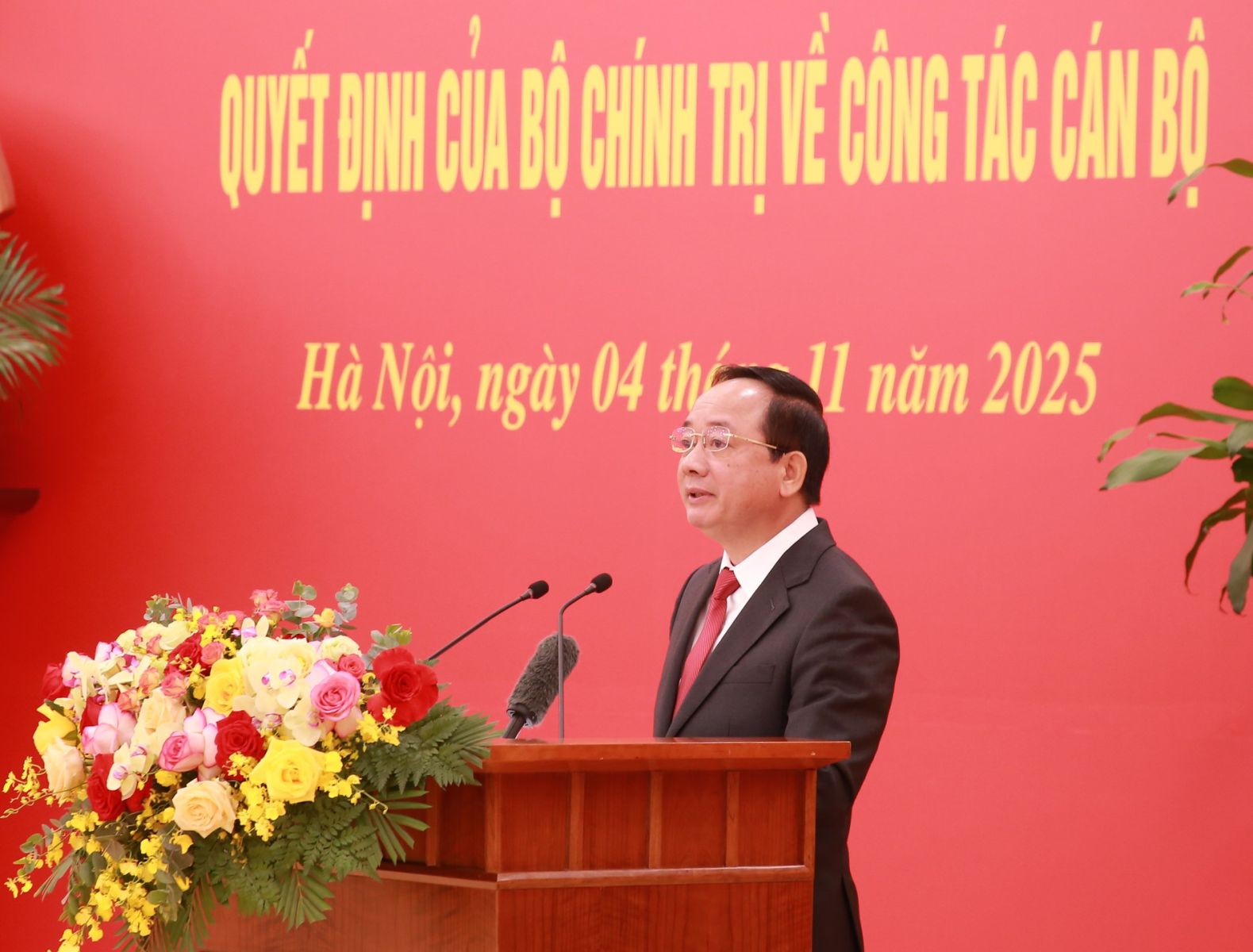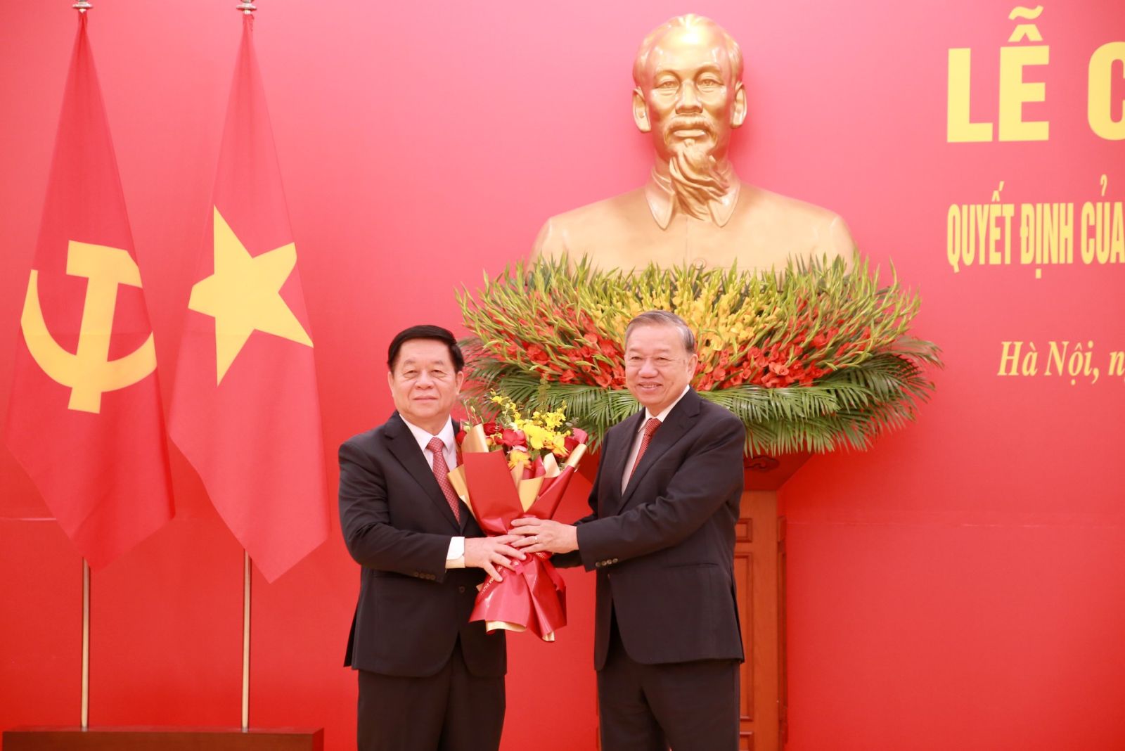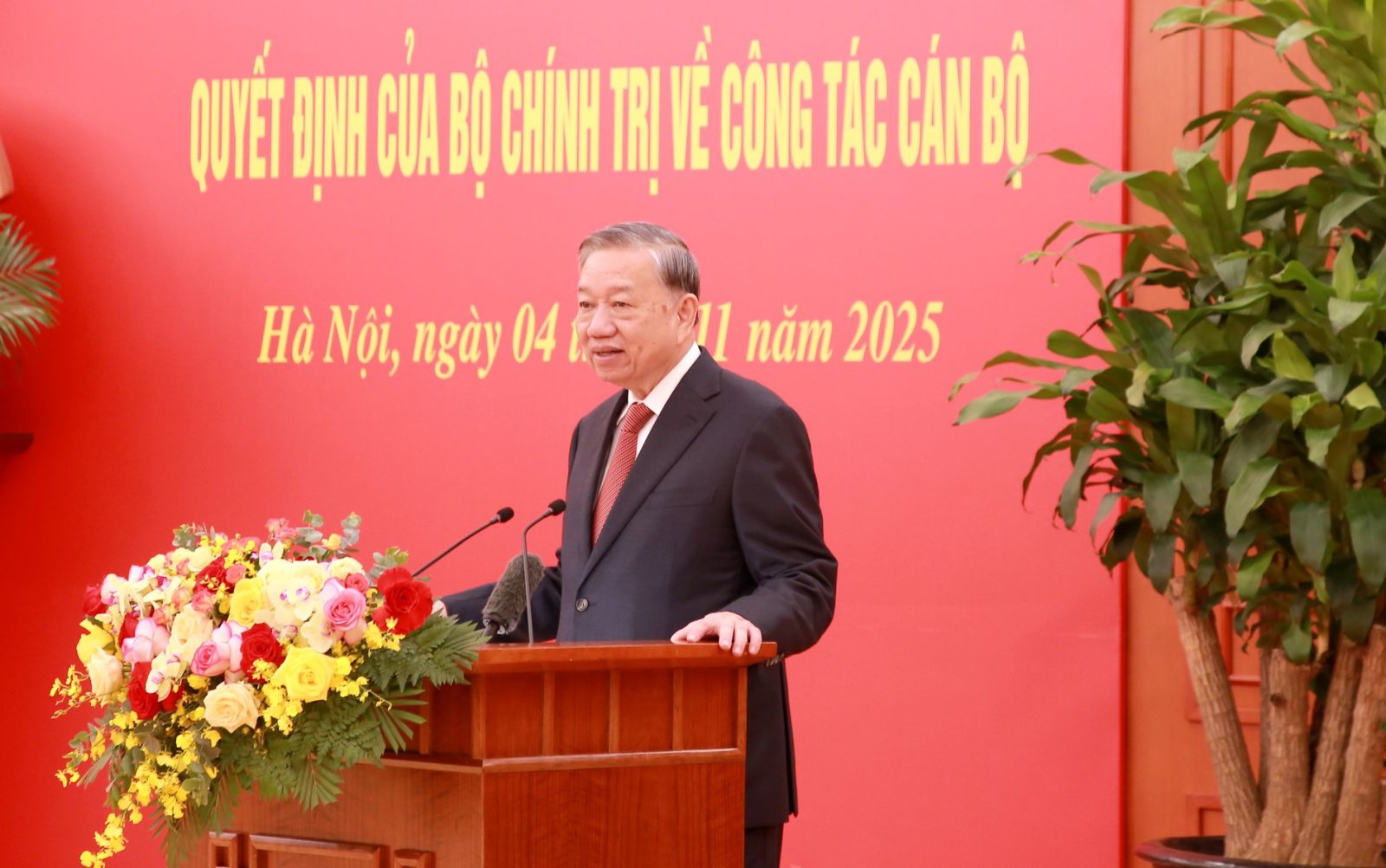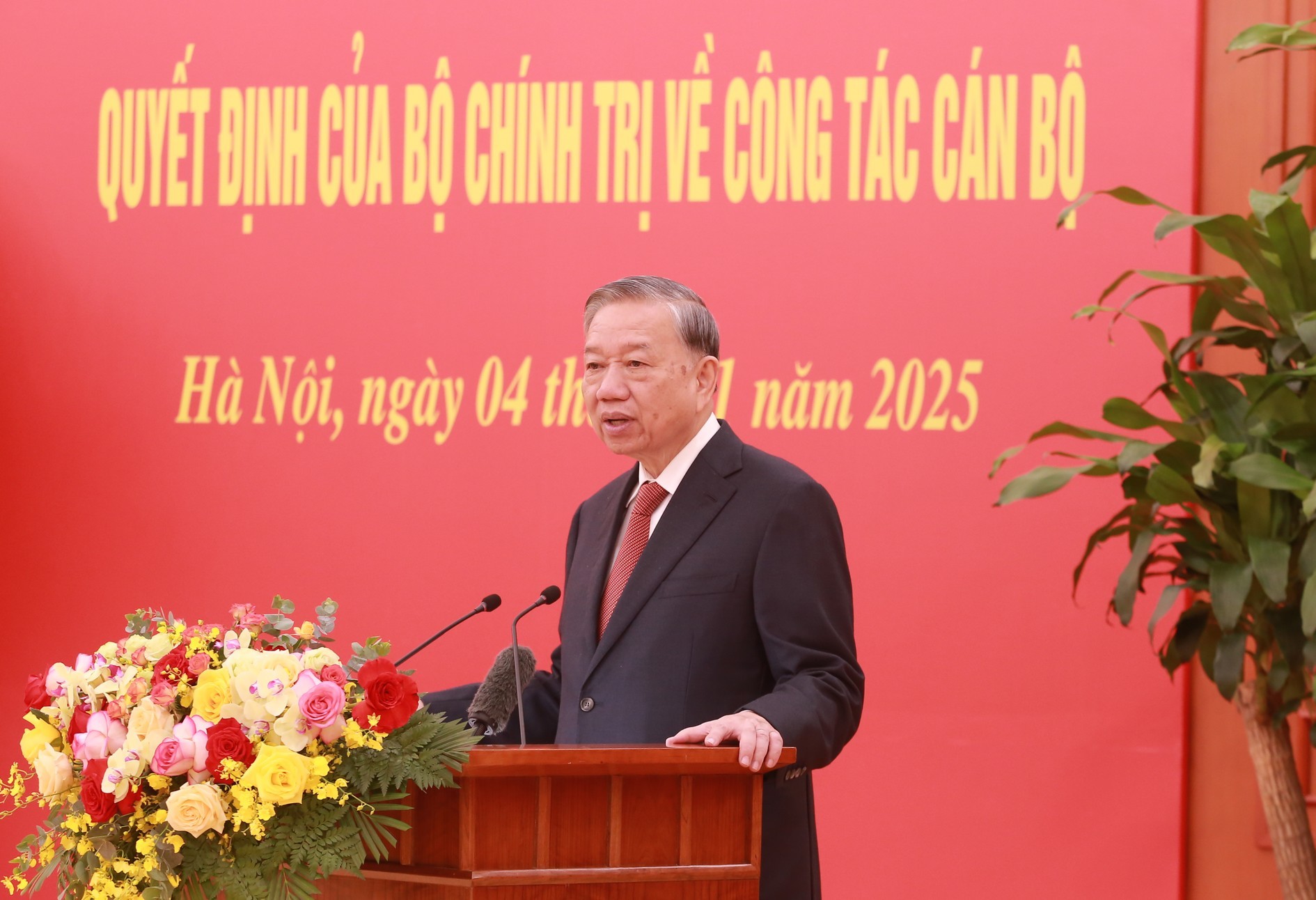 Tổng Bí thư Tô Lâm phát biểu chúc mừng và giao nhiệm vụ cho các đồng chí nhận nhiệm vụ mới.