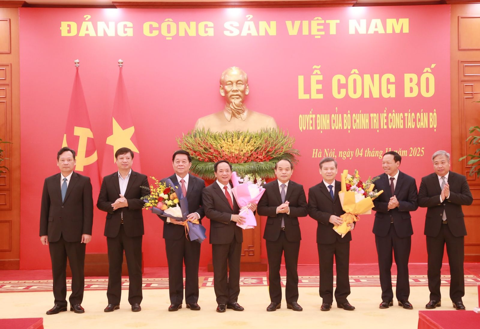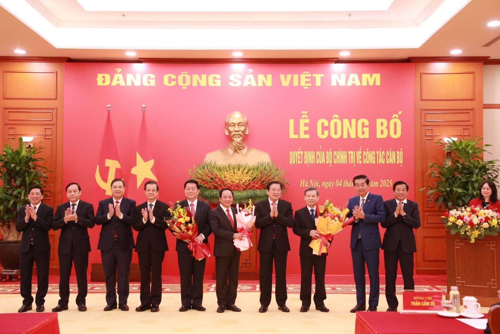 Đồng chí Lê Minh Hưng, Ủy viên Bộ Chính trị, Bí thư Trung ương Đảng, Trưởng Ban Tổ chức Trung ương chúc mừng các đồng chí nhận nhiệm vụ mới.