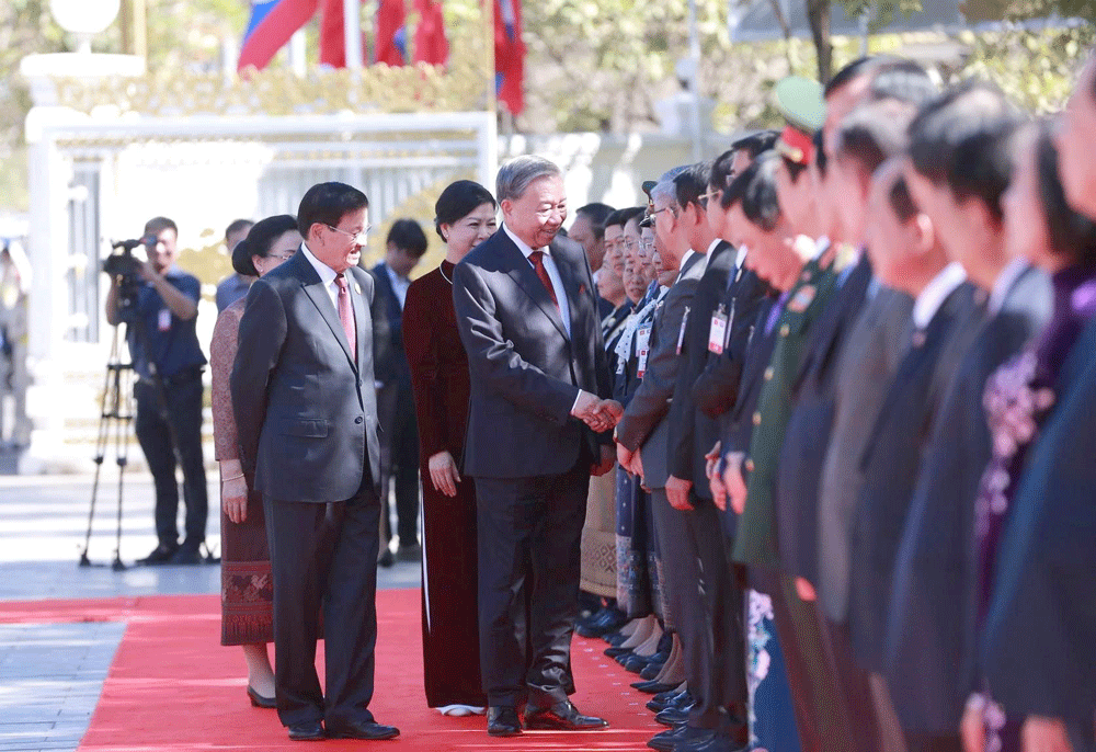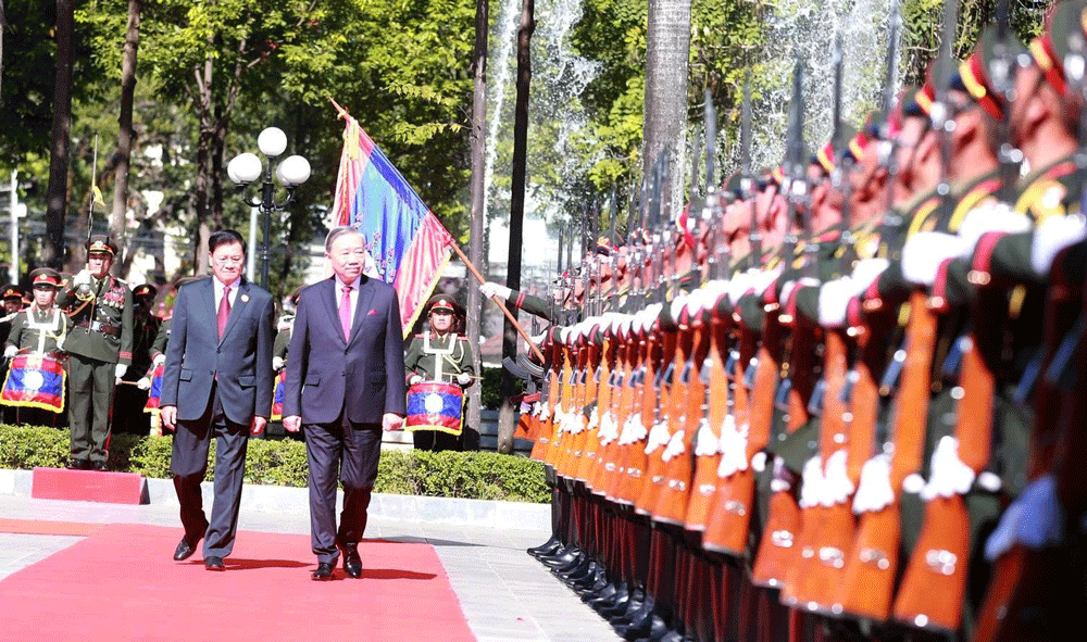 Quân nhạc cử Quốc thiều Việt Nam và Lào. Tổng Bí thư, Chủ tịch nước Lào Thongloun Sisoulith mời Tổng Bí thư Tô Lâm cùng duyệt đội danh dự.