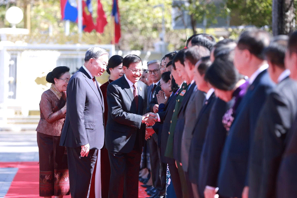 Đoàn xe chở Tổng Bí thư Tô Lâm và Phu nhân tiến vào Phủ Chủ tịch trong sự chào mừng nhiệt liệt của đông đảo các em học sinh và người dân thủ đô Vientiane trong những bộ trang phục truyền thống của nhân dân các dân tộc Lào và những lá cờ hai nước trên tay. Tổng Bí thư, Chủ tịch nước Lào Thongloun Sisoulith và Phu nhân chào đón Tổng Bí thư Tô Lâm và Phu nhân tại nơi đỗ xe.