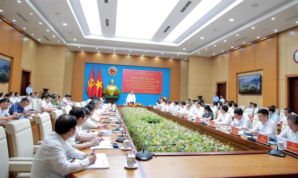 Sáng nay 10/6, đồng chí Tô Lâm, Tổng Bí thư Ban Chấp hành Trung ương Đảng làm việc với Ban Thường vụ Tỉnh ủy Phú Thọ, Vĩnh Phúc, Hòa Bình về tình hình và kết quả triển khai thực hiện các Nghị quyết, Kết luận của Trung ương; việc sắp xếp tổ chức bộ máy của địa phương (kể cả việc hợp nhất, sáp nhập); công tác ổn định tình hình mọi mặt của địa phương, công tác quốc phòng, an ninh; việc lãnh đạo thực hiện nhiệm vụ tăng trưởng kinh tế ở địa phương; công tác an sinh xã hội, giảm nghèo, nâng cao đời sống nhân dân và đề xuất, kiến nghị của địa phương.