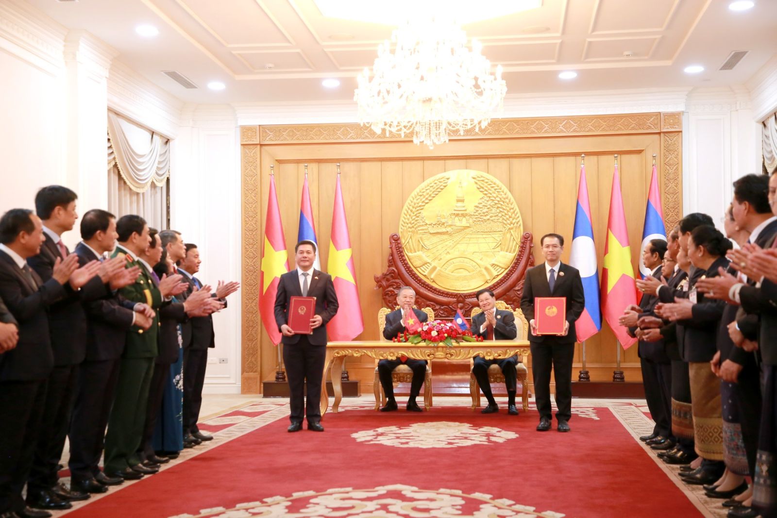 Tổng Bí thư Tô Lâm và Tổng Bí thư, Chủ tịch nước Lào Thongloun Sisoulith chứng kiến trao Biên bản ghi nhớ giữa Bộ Công Thương Việt Nam và Bộ Công Thương Lào về phát triển chuỗi liên kết công nghiệp giữa Việt Nam và Lào.