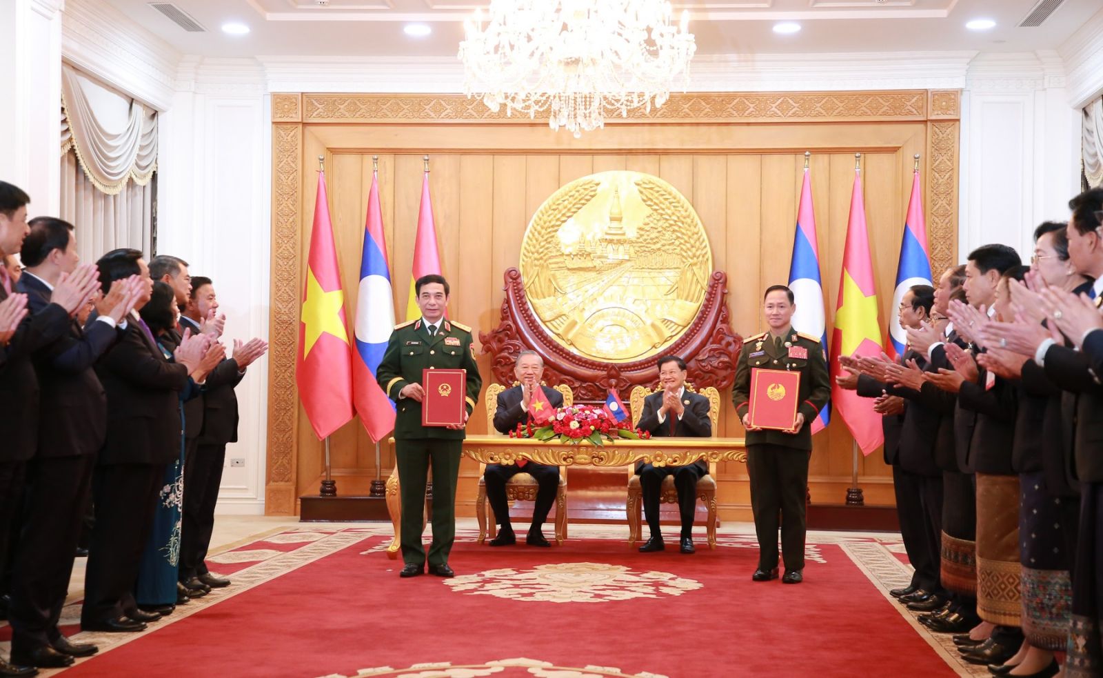 Tổng Bí thư Tô Lâm và Tổng Bí thư, Chủ tịch nước Lào Thongloun Sisoulith cùng Đoàn đại biểu cấp cao hai nước chứng kiến Lễ trao các Văn kiện hợp tác giữa Bộ Quốc phòng Việt Nam và Bộ Quốc phòng Lào.