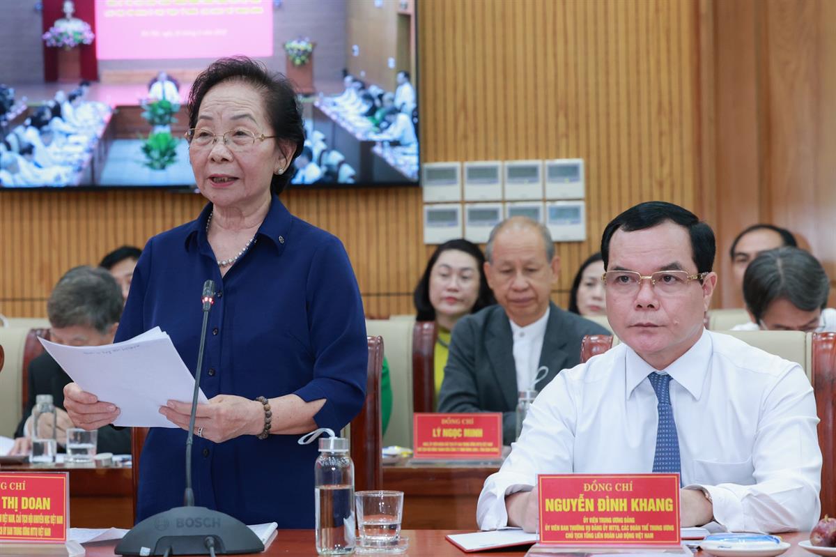 Đồng chí Nguyễn Thị Doan, nguyên Phó Chủ tịch nước, Phó Chủ tịch không chuyên trách Ủy ban Trung ương MTTQ Việt Nam phát biểu tại buổi làm việc.
