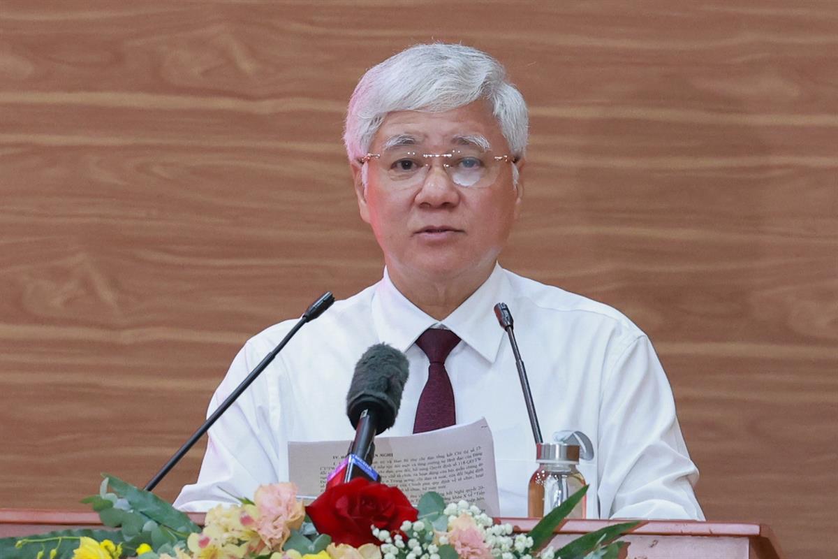 Đồng chí Đỗ Văn Chiến, Ủy viên Bộ Chính trị, Bí thư Trung ương Đảng, Bí thư Đảng ủy MTTQ, các đoàn thể Trung ương, Chủ tịch Ủy ban Trung ương MTTQ Việt Nam trình bày báo cáo tại buổi làm việc. |
