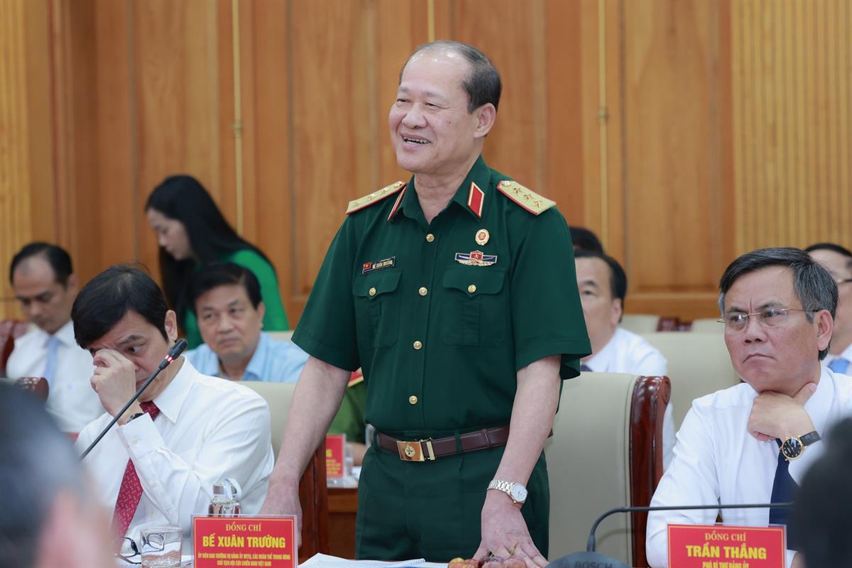 | Đồng chí Bế Xuân Trường, Ủy viên Ban Thường vụ Đảng ủy MTTQ, các đoàn thể Trung ương, Chủ tịch Hội Cựu chiến binh Việt Nam phát biểu tại buổi làm việc. |