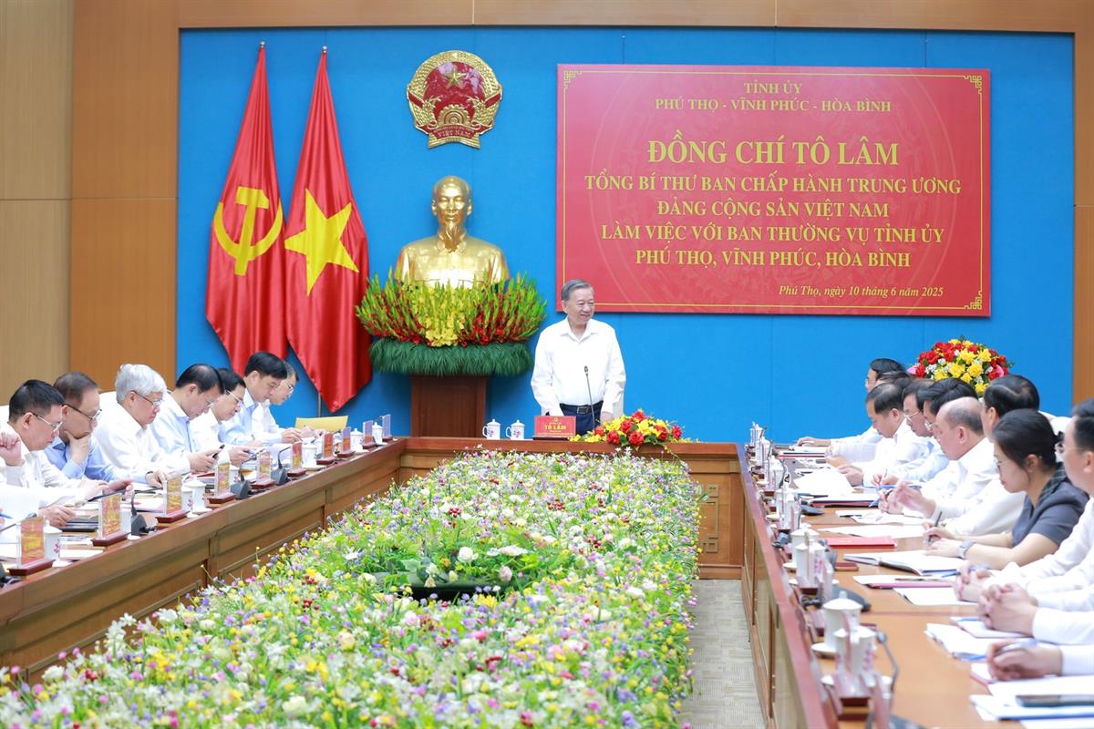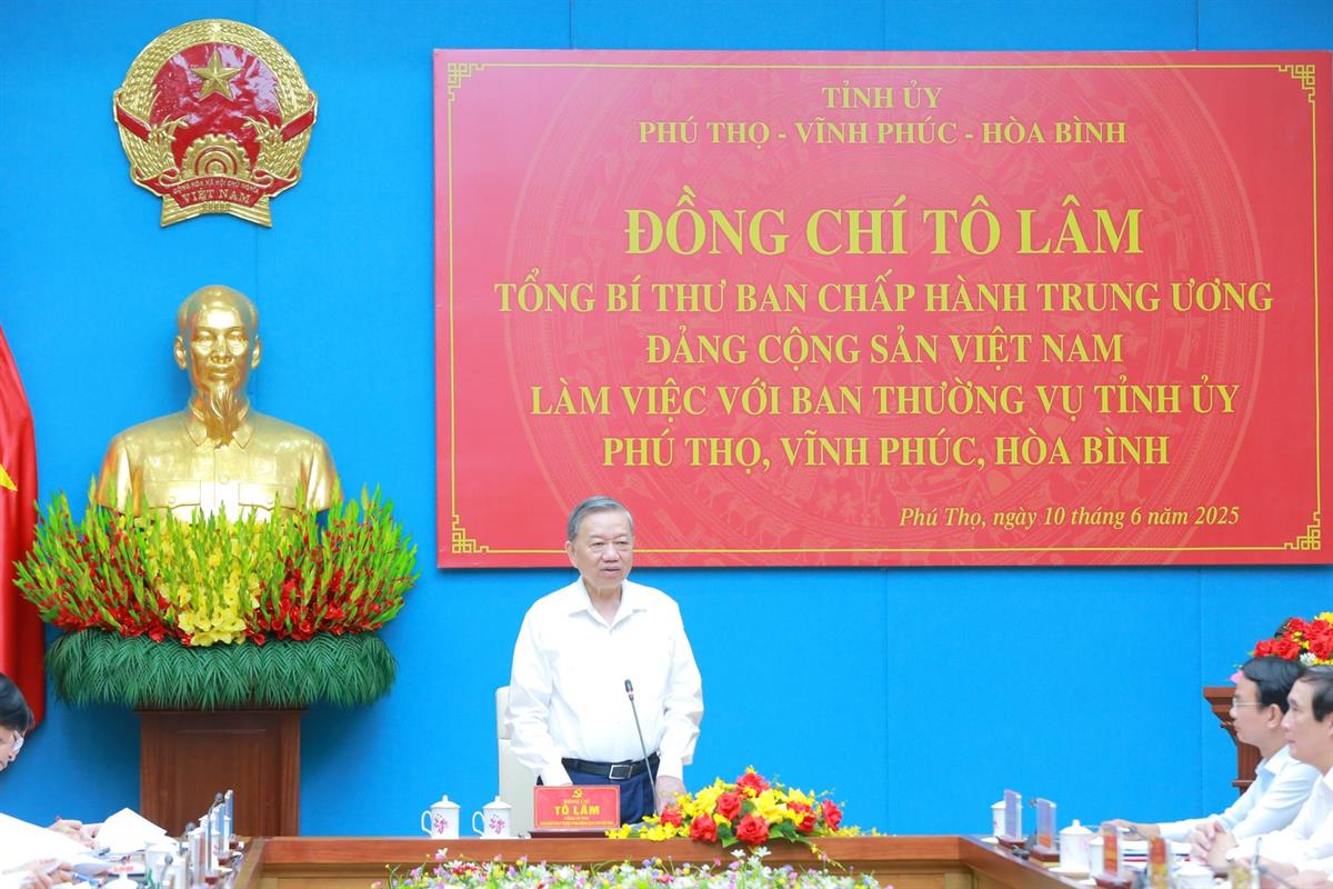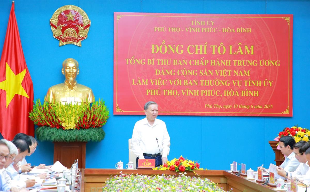 (ĐCSVN) - Sáng10/6, Tổng Bí thư Tô Lâm đã có buổi làm việc với Ban Thường vụ Tỉnh ủy Phú Thọ, Vĩnh Phúc, Hòa Bình về tình hình và kết quả triển khai thực hiện các Nghị quyết, Kết luận của Trung ương; việc sắp xếp tổ chức bộ máy của địa phương (kể cả việc hợp nhất, sáp nhập); công tác ổn định tình hình mọi mặt của địa phương, công tác quốc phòng, an ninh; việc lãnh đạo thực hiện nhiệm vụ tăng trưởng kinh tế ở địa phương; công tác an sinh xã hội, giảm nghèo, nâng cao đời sống nhân dân và đề xuất, kiến nghị của địa phương.