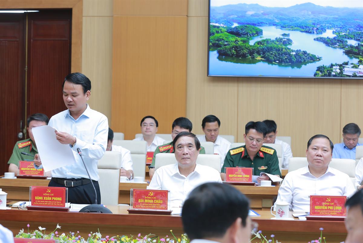 | Đồng chí Đặng Xuân Phong, Ủy viên BCH Trung ương Đảng, Bí thư Tỉnh ủy, Trưởng Đoàn ĐBQH tỉnh Vĩnh Phú đại diện lãnh đạo 3 tỉnh trình bày báo cáo tại buổi làm việc. |
