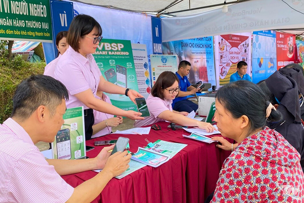 | Cán bộ Ngân hàng CSXH hỗ trợ khách hàng cài đặt ứng dụng VBSP Smart Banking. |