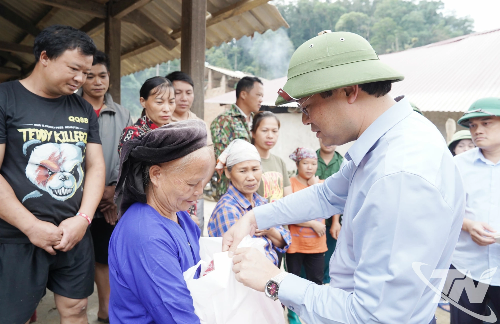 Tiếp đó, đồng chí Bí thư Tỉnh ủy và Đoàn công tác trao quà hỗ trợ gồm lương thực, thực phẩm và đồ dùng thiết yếu cho các hộ gia đình; chuyển quà của Bộ Quốc phòng gồm chăn, màn tặng 14 hộ dân bị thiệt hại do ngập lụt.