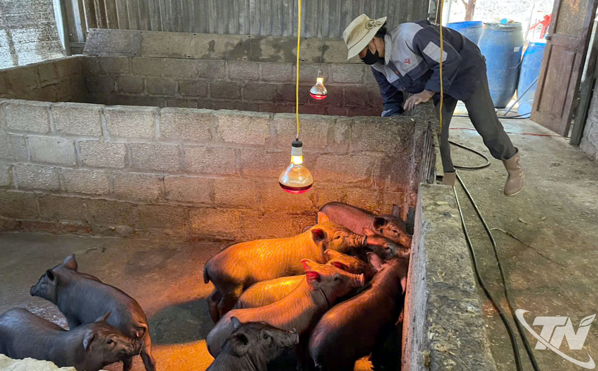 | Chị Mã Thị Đới, ở thôn Nà Giảo (xã Thượng Minh) thắp điện giữ ấm cho đàn lợn trong những ngày nhiệt độ xuống thấp. |