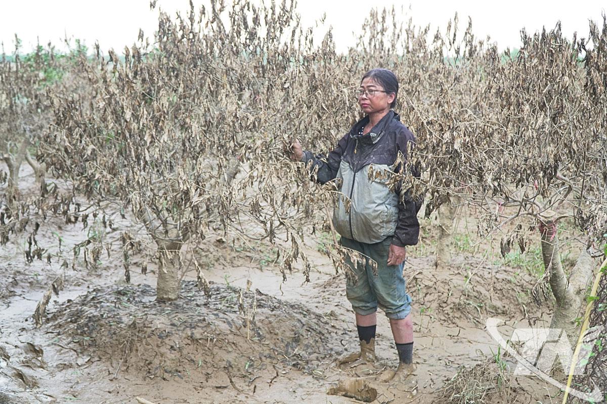 Cũng ở tổ 5, bà Nguyễn Thị Hải Hà những ngày này vẫn ra vườn thu gom những gì còn sót lại. Hơn 500 gốc đào của gia đình mất trắng, ước thiệt hại 500-600 triệu đồng. Bà nghẹn ngào kể: Chưa bao giờ tôi thấy trận lũ nào khủng khiếp như thế. Đồ đạc còn di dời được, chứ vườn đào ngập sâu hai, ba ngày thì không thể cứu nổi. Giờ muốn khôi phục phải thuê máy nhổ gốc chết, thuê nhân công cải tạo đất, lại thêm tiền khử khuẩn, xử lý mầm bệnh. Mong ngân hàng giảm lãi suất, cho giãn nợ để bà con có điều kiện làm lại.