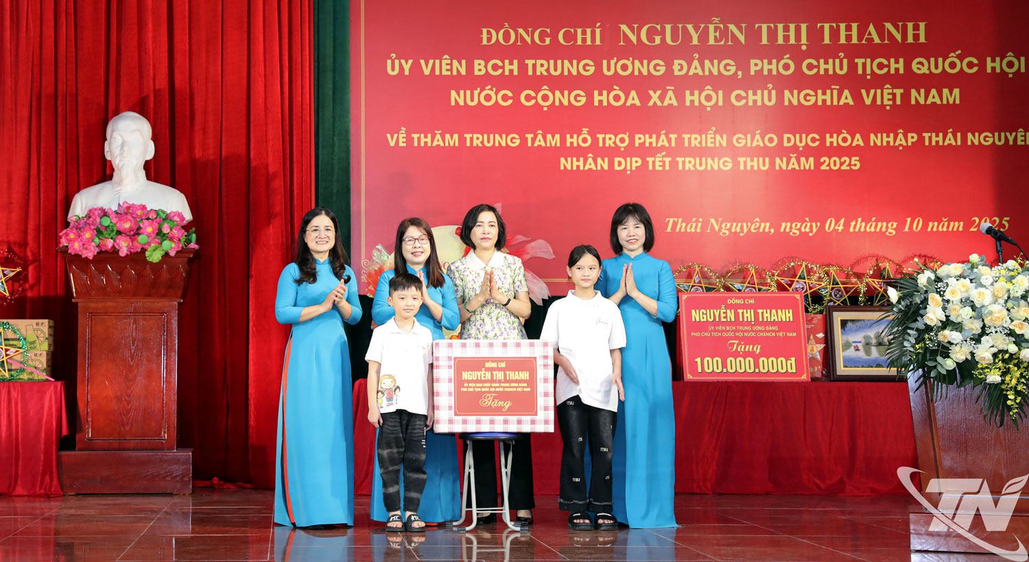 | Đoàn công tác do đồng chí Phó Chủ tịch Quốc hội Nguyễn Thị Thanh, làm Trưởng đoàn đến thăm, tặng quà Trung thu tại Trung tâm Hỗ trợ phát triển giáo dục hòa nhập Thái Nguyên (phường Phan Đình Phùng). |