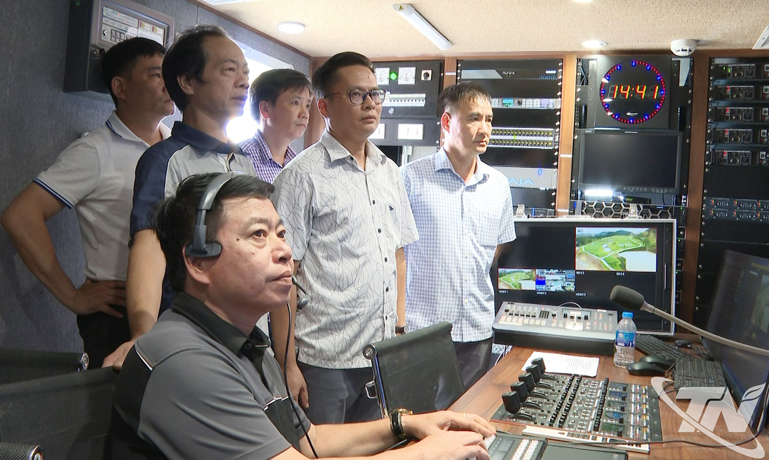 | Lãnh đạo Báo và Phát thanh, Truyền hình Thái Nguyên kiểm tra công tác chuẩn bị kỹ thuật tại một điểm cầu. |