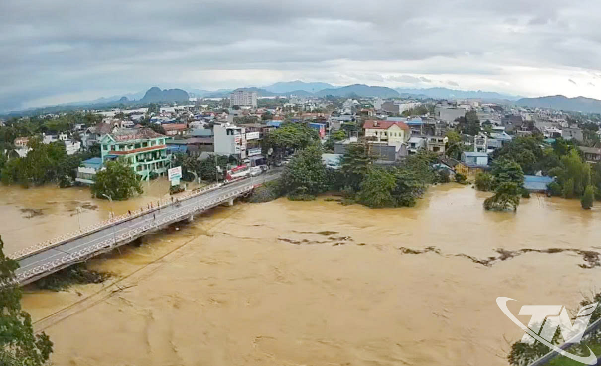 | Cầu Gia Bẩy trong đợt mưa lũ lịch sử do ảnh hưởng bão số 11. |