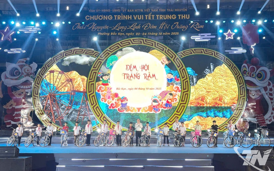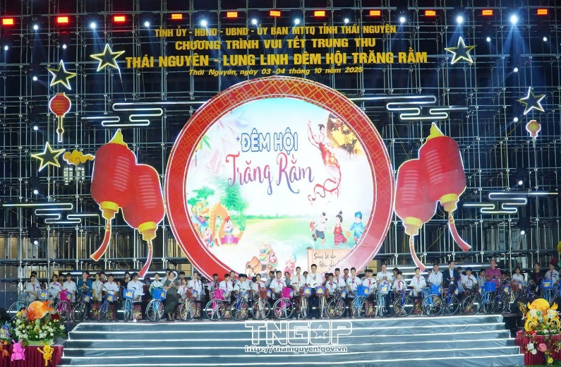 Trong đêm hội, các đồng chí lãnh đạo tỉnh đã trao tặng 50 chiếc xe đạp và 10 suất quà cho học sinh có hoàn cảnh khó khăn của các xã, phường khu vực phía Nam tỉnh, góp phần động viên các em vươn lên trong học tập. Công ty TNHH Samsung Electronics Việt Nam Thái Nguyên cũng trao biển tượng trưng tổng nguồn lực hỗ trợ tỉnh Thái Nguyên tổ chức Chương trình Trung thu năm 2025 trị giá 650 triệu đồng.