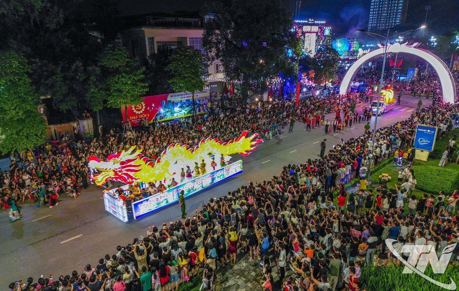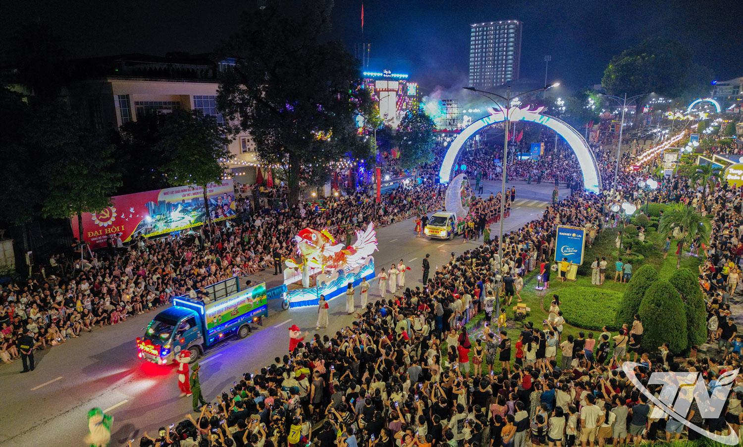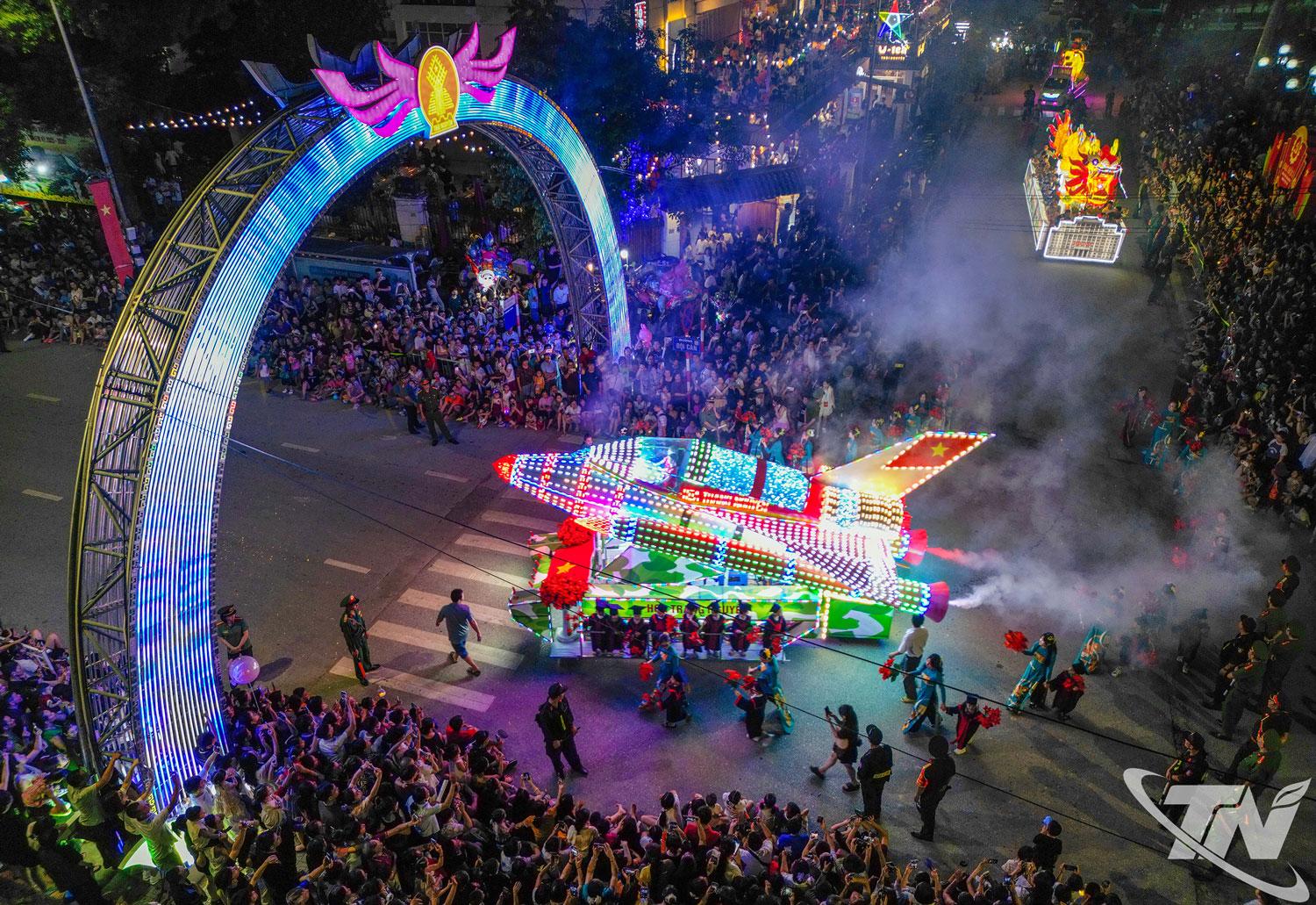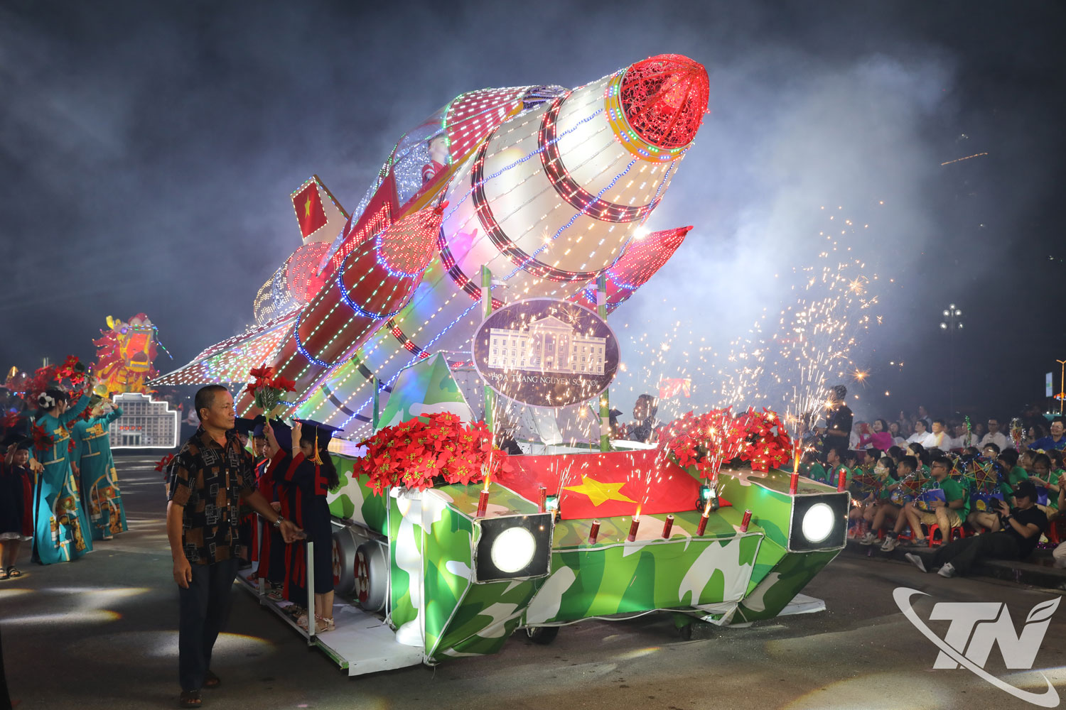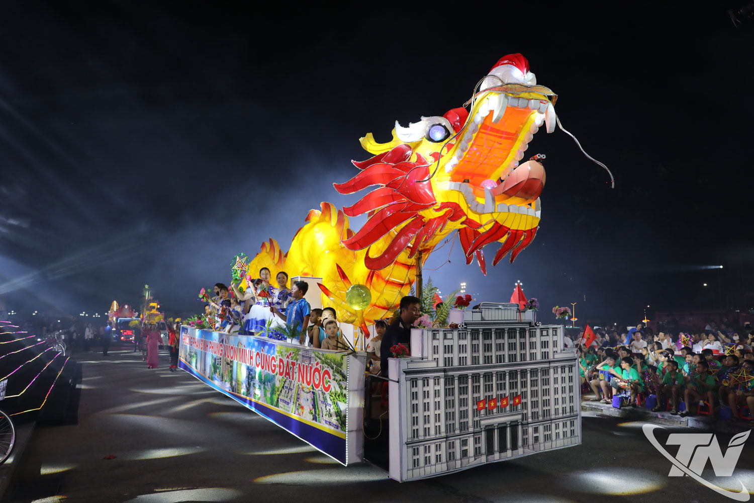 Điểm nhấn đặc sắc của Đêm hội là màn diễn diễu các mô hình đèn Trung thu. 11 mô hình xuất sắc đạt giải cấp tỉnh cùng hội tụ, tạo nên bức tranh lung linh, sáng tạo.