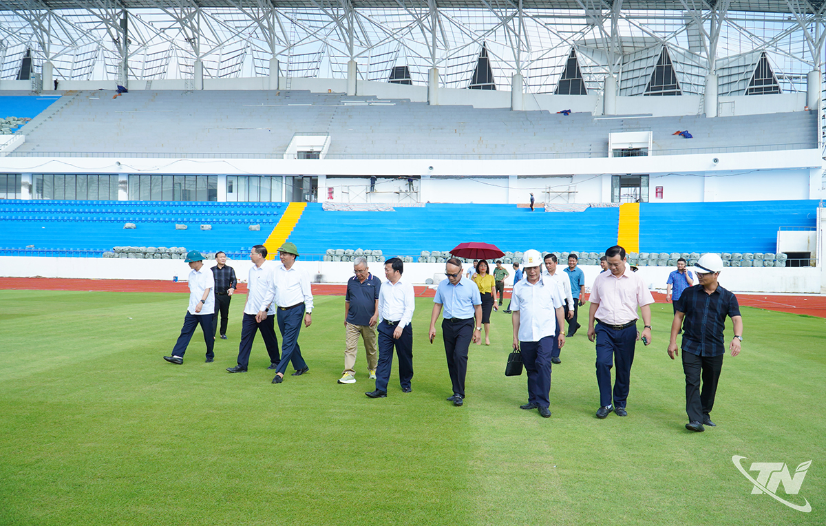Trước buổi làm việc, đồng chí Bùi Văn Lương cùng Đoàn công tác trực tiếp kiểm tra tiến độ thi công Sân vận động; rà soát toàn bộ các hạng mục như: mặt cỏ thi đấu, khán đài, hệ thống âm thanh, ánh sáng, phòng chức năng, khu vực kỹ thuật, an ninh, hệ thống phòng cháy, chữa cháy, lối thoát hiểm.