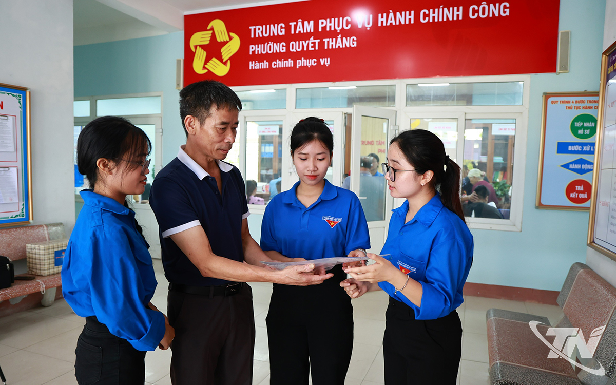 | Lực lượng đoàn viên thanh niên hỗ trợ người dân đến giải quyết thủ tục hành chính tại phường Quyết Thắng. |