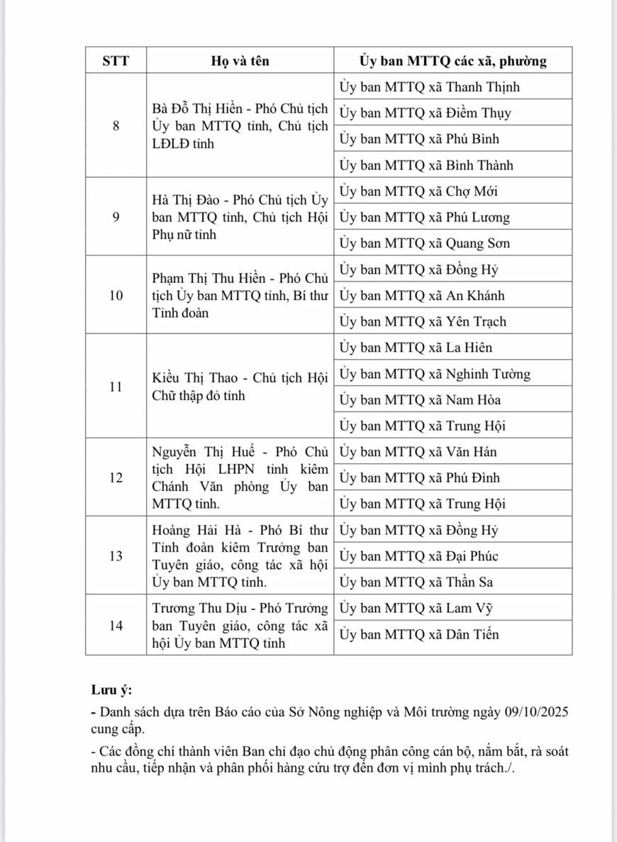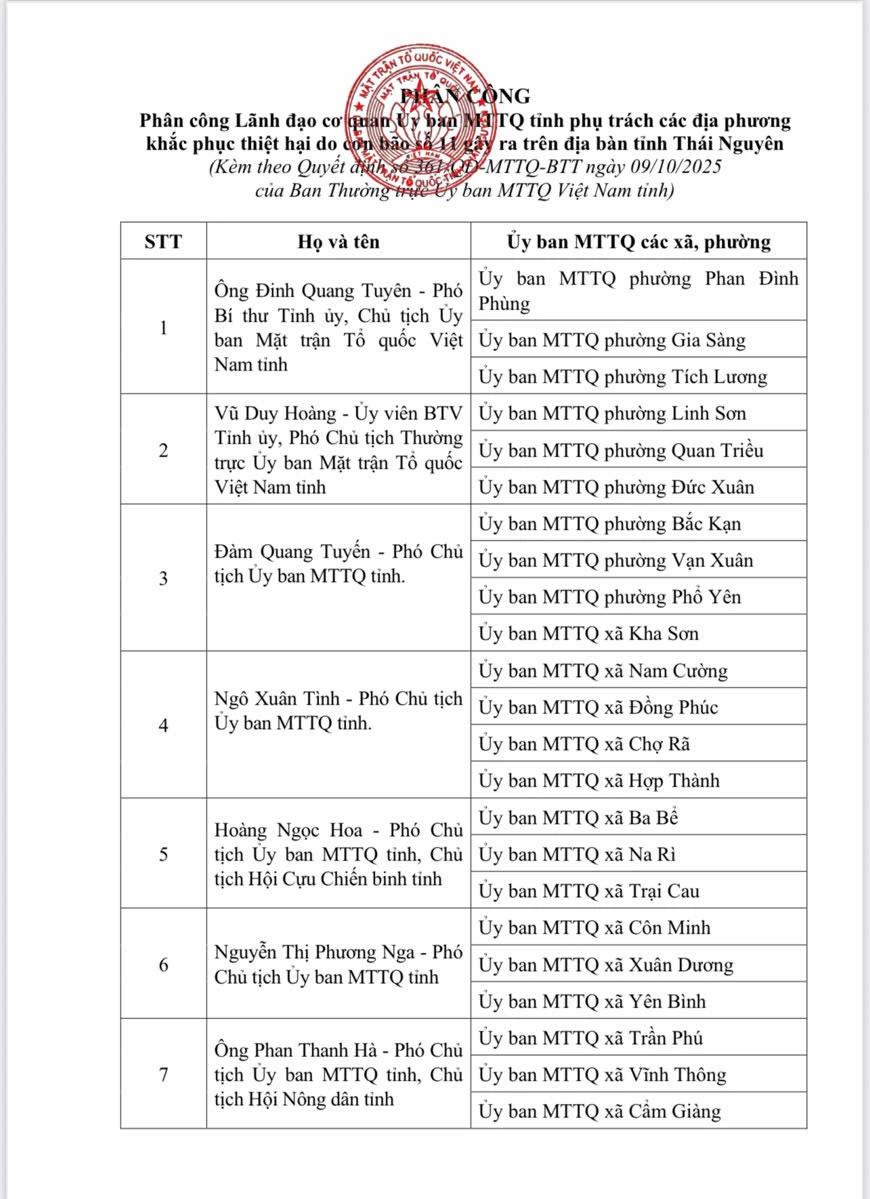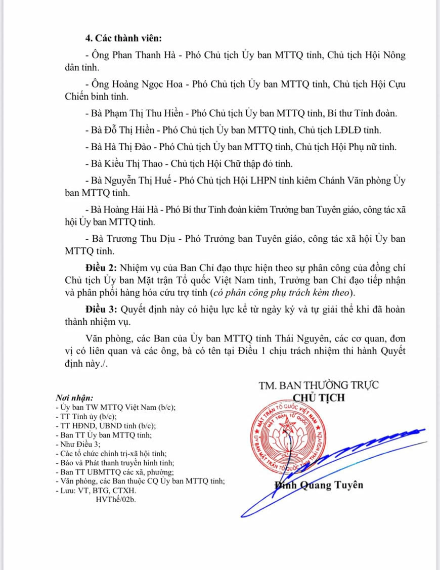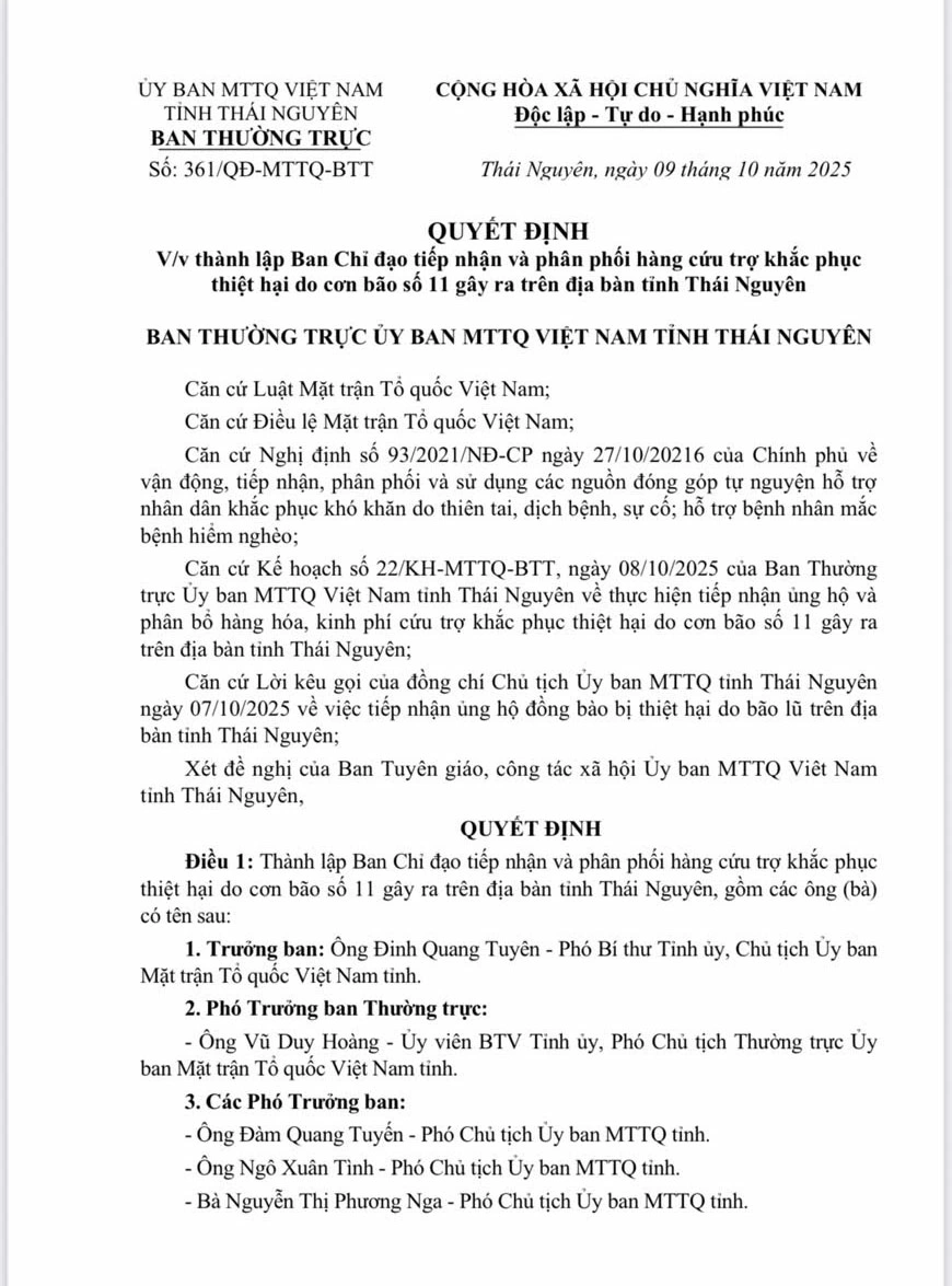 Ban Thường trực Ủy ban MTTQ tỉnh quyết định thành lập Ban Chỉ đạo tiếp nhận và phân phối hàng cứu trợ khắc phục thiệt hại do cơn bão số 11 trên địa bàn tỉnh Thái Nguyên.