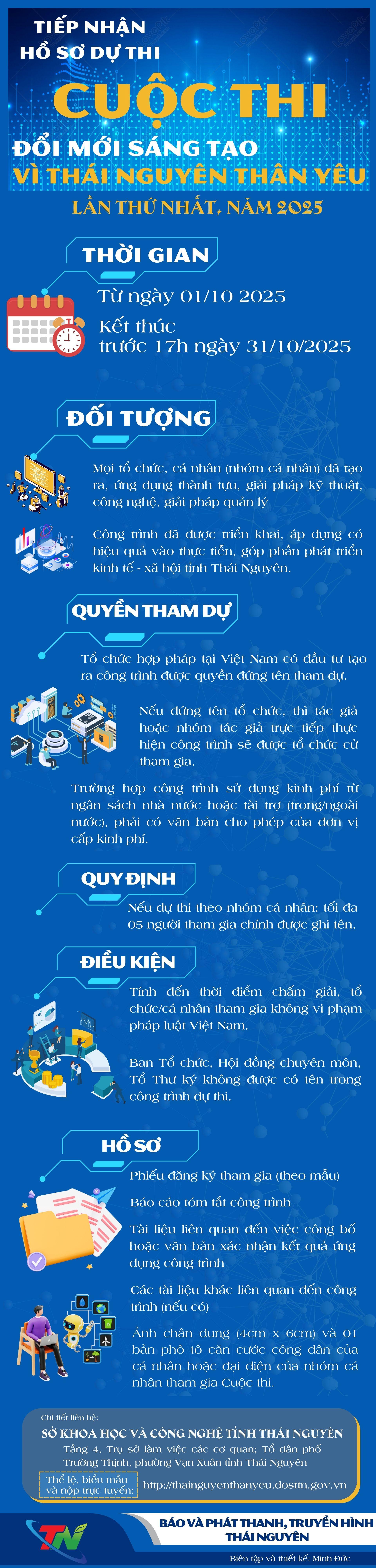 Thứ năm, 02/10/2025 | 18:42 A- A A+ | Tiếp nhận hồ sơ Cuộc thi 'Đổi mới sáng tạo – Vì Thái Nguyên thân yêu' lần thứ nhất TNĐT / baothainguyen.vn Từ khóa: tiếp nhận hồ sơ đổi mới sáng tạo Thái Nguyên Các tin khác Đánh giá công tác quy hoạch và đầu tư xây dựng của Thái Nguyên trong vùng Thủ đô Chuyển động mới ở Thần Sa BIDV Thái Nguyên khai trương Phòng giao dịch Định Hóa Bảo đảm chất lượng các nội dung trình kỳ họp cuối năm của HĐND tỉnh Công bố nhãn hiệu 'Thịt lợn trà xanh - Tinh hoa Thái Nguyên' Thái Nguyên: Chuẩn bị chu đáo cho Lễ khánh thành, khởi công các công trình chào mừng Đại hội Đảng