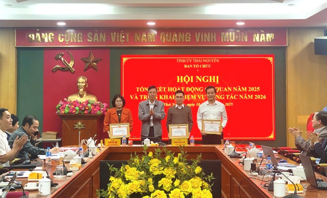 Nhân dịp này, Ban Tổ chức Tỉnh ủy đã khen thưởng các tập thể, cá nhân có thành tích tiêu biểu trong công tác năm 2025. Phát biểu kết luận hội nghị, đồng chí Dương Văn Tiến ghi nhận, biểu dương tinh thần trách nhiệm, sự nỗ lực của tập thể Ban Tổ chức Tỉnh ủy trong năm 2025; đồng thời nhấn mạnh một số nhiệm vụ trọng tâm năm 2026. Trong đó, tập trung tham mưu cụ thể hóa, triển khai thực hiện Nghị quyết Đại hội XIV của Đảng và nghị quyết đại hội đảng bộ các cấp; xây dựng và triển khai Chương trình công tác toàn khóa và năm 2026 bảo đảm tiến độ, chất lượng; tiếp tục chuẩn bị tốt công tác nhân sự phục vụ Đại hội XIV của Đảng, bầu cử đại biểu Quốc hội khóa XVI và đại biểu Hội đồng nhân dân các cấp nhiệm kỳ 2026 - 2031; tham mưu vận hành tổ chức bộ máy của hệ thống chính trị theo mô hình mới, bảo đảm thông suốt, đồng bộ, đáp ứng yêu cầu nhiệm vụ trong giai đoạn mới.