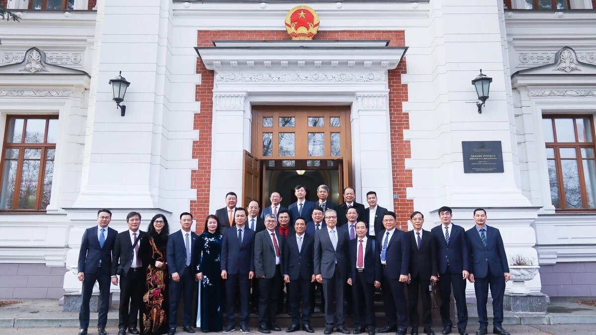 Đại sứ Đặc mệnh toàn quyền Việt Nam tại Liên bang Nga Đặng Minh Khôi cùng cán bộ, nhân viên Đại sứ quán tiếp và làm việc với đoàn.