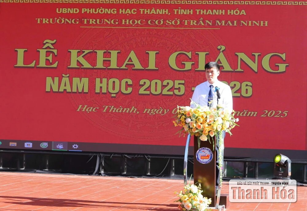 Dự lễ khai giảng tại điểm cầu Trường THCS Trần Mai Ninh, tỉnh Thanh Hóa, có các đồng chí: Nguyễn Doãn Anh, Ủy viên Trung ương Đảng, Bí thư Tỉnh ủy; Đỗ Minh Tuấn, Phó Bí thư Tỉnh ủy, Chủ tịch UBND tỉnh; lãnh đạo Sở GD&ĐT, phường Hạc Thành cùng các thầy cô giáo, các bậc phụ huynh và toàn thể các em học sinh Trường THCS Trần Mai Ninh.