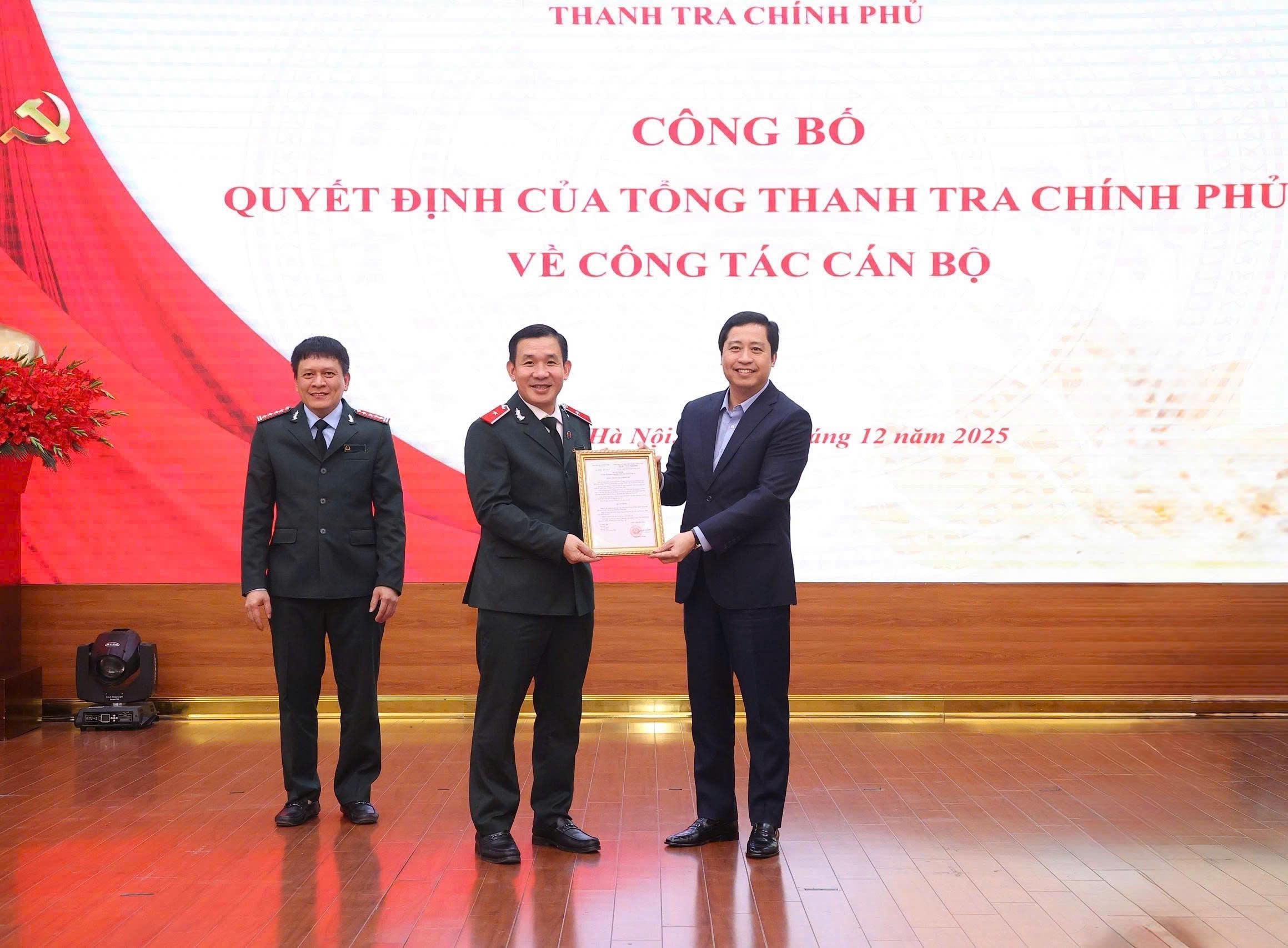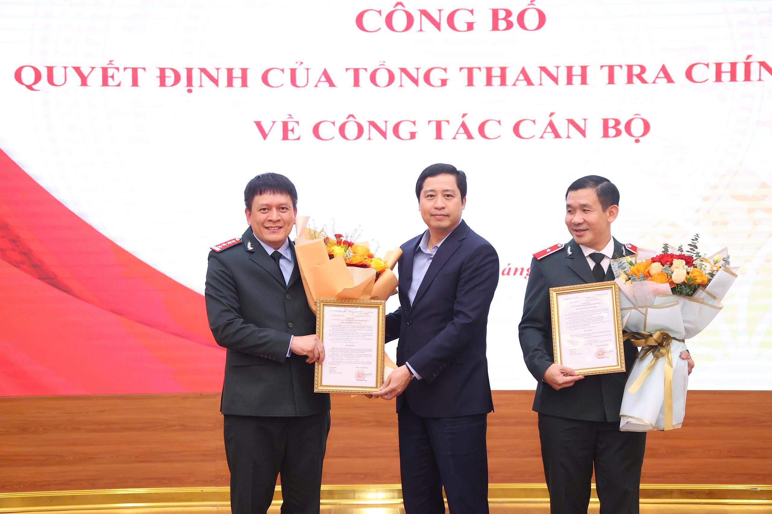 Thay mặt lãnh đạo Thanh tra Chính phủ, Phó Tổng Thanh tra Chính phủ Dương Quốc Huy trao quyết định và chúc mừng hai đồng chí mới được điều động, bổ nhiệm.