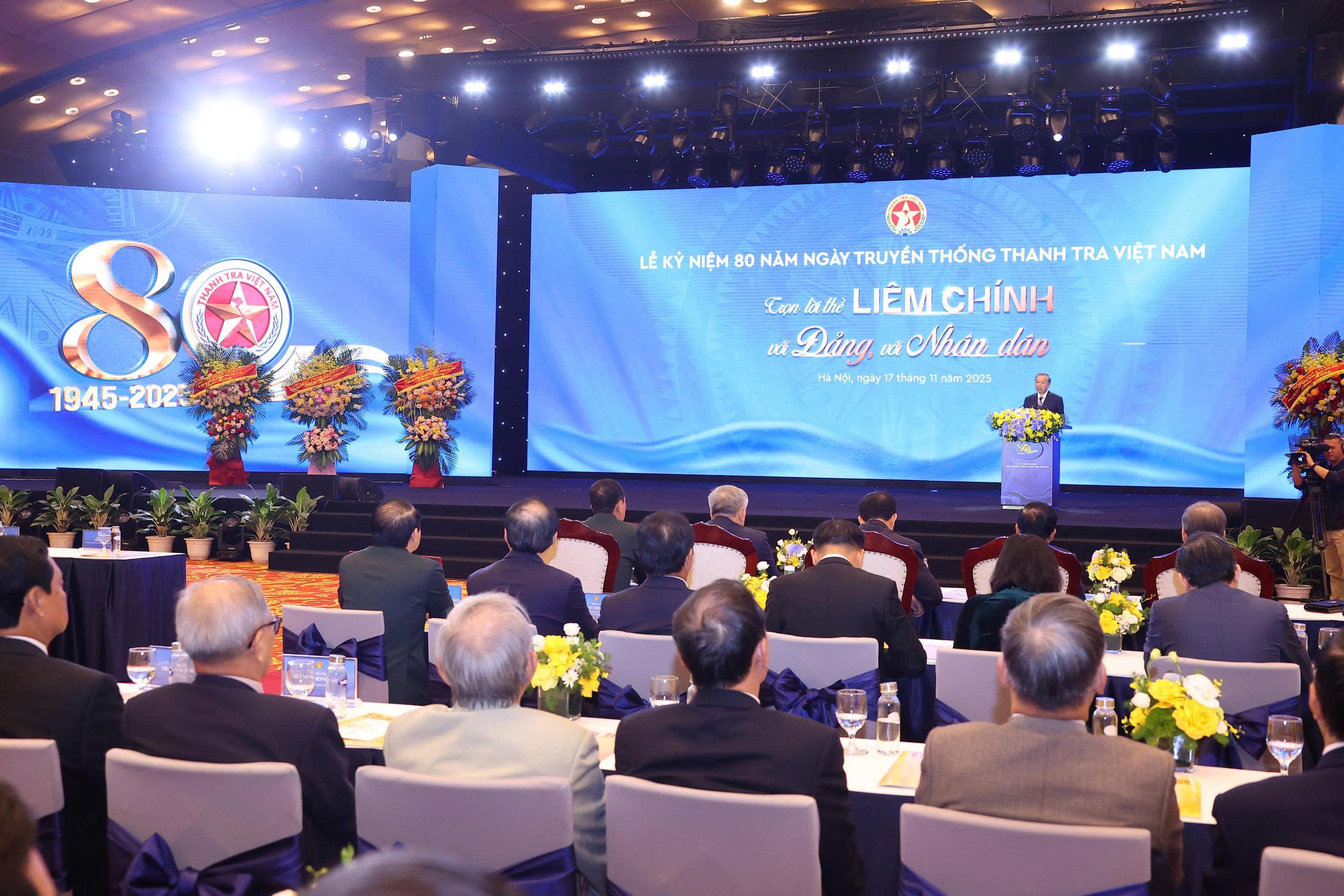 Bảy tỏ rất vui mừng đến dự Lễ kỷ niệm 80 năm Ngày truyền thống Thanh tra Việt Nam (23/11/1945 - 23/11/2025), Tổng Bí thư Tô Lâm ghi nhận trải qua 80 năm xây dựng, phát triển và trưởng thành, ngành Thanh tra Việt Nam đã hòa cùng những chặng đường lịch sử vẻ vang của đất nước. Trong thời kỳ đổi mới và hội nhập, cán bộ thanh tra tiếp tục là lực lượng quan trọng bảo vệ tính liêm chính của bộ máy nhà nước, phòng ngừa, phát hiện và xử lý các hành vi vi phạm, đặc biệt là tham nhũng, lãng phí, tiêu cực. Ở đâu có công tác thanh tra, ở đó kỷ cương được thiết lập, niềm tin được củng cố, pháp luật được thượng tôn.