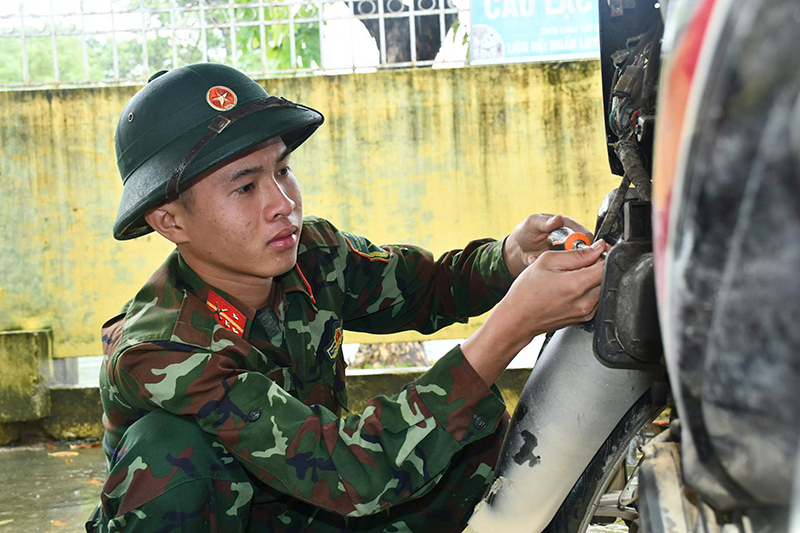 Cán bộ, chiến sĩ Quân đội tích cực sửa chữa xe cho sinh viên.