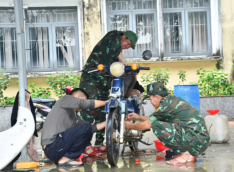 Không chỉ kịp thời chăm lo để mọi người dân không bị đói, bị rét trong mưa lũ mà trong những ngày qua mưa lũ đã làm hàng nghìn xe máy của sinh viên các trường trên địa bàn bị ngập nước, hư hỏng. Nhận được đề nghị từ các trường đại học, cao đẳng trên địa bàn, Bộ CHQS thành phố Huế đã điều động các cán bộ, chiến sĩ có trình độ, kinh nghiệm từ các cơ quan, đơn vị để hỗ trợ sửa xe miễn phí cho các sinh viên. Chung sức cùng Bộ đội, gần 20 thành viên Câu lạc bộ xe máy Diễn Châu, Nghệ An cũng vượt đường sá xa xôi vào Huế cùng cán bộ, chiến sĩ hỗ trợ sinh viên khắc phục hậu quả mưa lũ. Trung bình mỗi ngày có khoảng 200 chiếc xe máy được kiểm tra, sửa chữa, thay thế linh kiện miễn phí và bàn giao lại cho các em sinh viên.