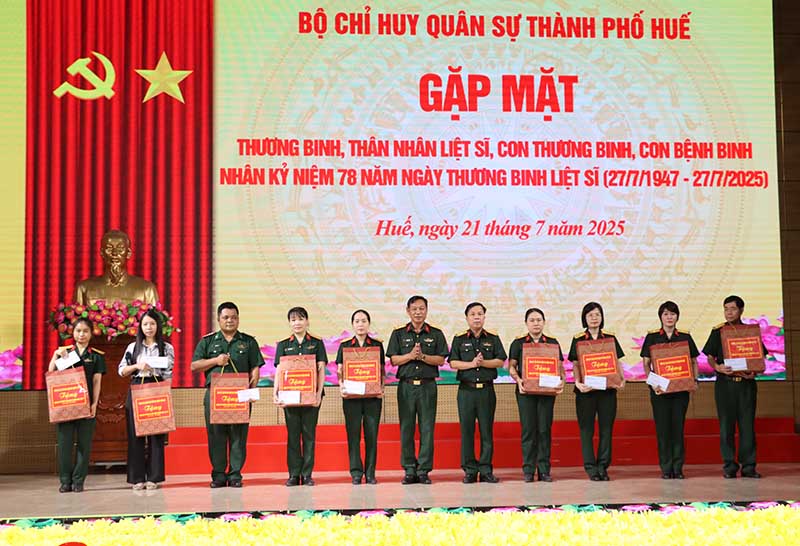 Ngày 21/7, Bộ Chỉ huy Quân sự (CHQS) thành phố Huế tổ chức gặp mặt 118 đồng chí là thương binh, thân nhân liệt sĩ, con thương binh, con bệnh binh đang công tác tại các cơ quan, đơn vị trực thuộc Bộ CHQS thành phố Huế nhân kỷ niệm 78 năm Ngày Thương binh – Liệt sĩ (27/7/1947 – 27/7/2025). Đại tá Phan Thắng, Ủy viên Ban Thường vụ Thành ủy, Chỉ huy trưởng tham dự buổi gặp mặt. Thượng tá Trương Viết Hải, Phó Bí thư Đảng ủy, Chính ủy Bộ CHQS thành phố Huế chủ trì buổi gặp mặt.
