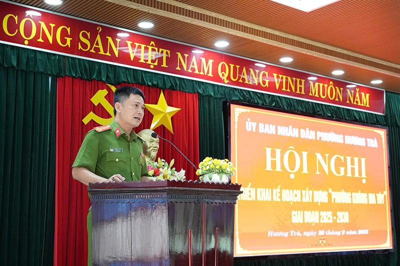 Tại Hội nghị, đồng chí Trung tá Hoàng Thế Anh UVTV, Trưởng Công an phường đã trình bày Kế hoạch số 606/KH-UBND ngày 26 tháng 8 năm 2025 của UBND phường Hương Trà về xây dựng “phường không ma túy” giai đoạn 2025 – 2030. Theo đó, kế hoạch có 3 tiêu chí bao gồm: không có người hiện đang cư trú trên địa bàn nghiện ma túy, sử dụng trái phép chất ma túy, trừ người đang tham gia điều trị nghiện ma túy bằng thuốc thay thế, người đang cai nghiện tại gia đình, cộng đồng và người đang bị quản lý sau cai nghiện ma túy; không có người hiện đang cư trú trên địa bàn vi phạm pháp luật về ma túy trên địa bàn, không có đối tượng bị truy nã do phạm tội về ma túy lẩn trốn trên địa bàn; không có điểm tổ chức, chứa chấp sử dụng trái phép chất ma túy.