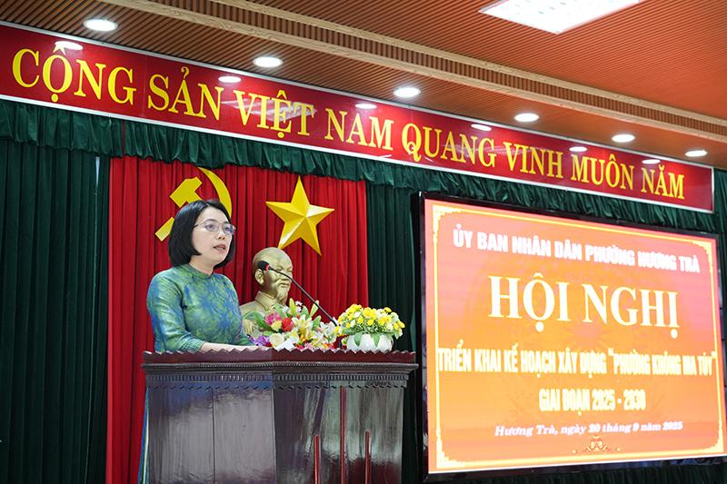 Phát biểu chỉ đạo tại Hội nghị, bà Nguyễn Thị Thanh Toàn – Phó Bí thư Thường trực Đảng ủy phường đề nghị các cấp ủy, tổ dân phố, các ngành, đoàn thể, cán bộ, đảng viên phải gương mẫu đi đầu trong tuyên truyền, vận động nhân dân thực hiện. Đồng thời, nêu cao tinh thần trách nhiệm, đoàn kết, quyết tâm, kiên trì thực hiện để mục tiêu phường Hương Trà “không ma túy” sớm trở thành hiện thực, góp phần xây dựng phường ngày càng văn minh, an toàn, phát triển bền vững.